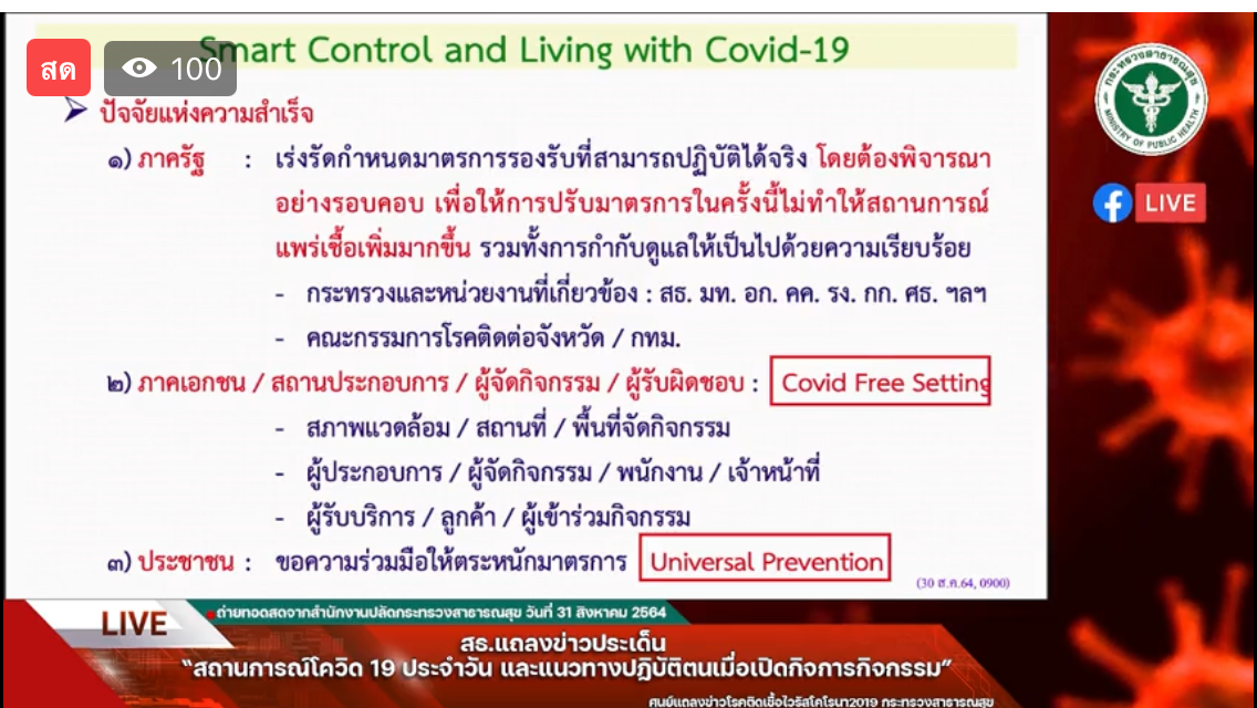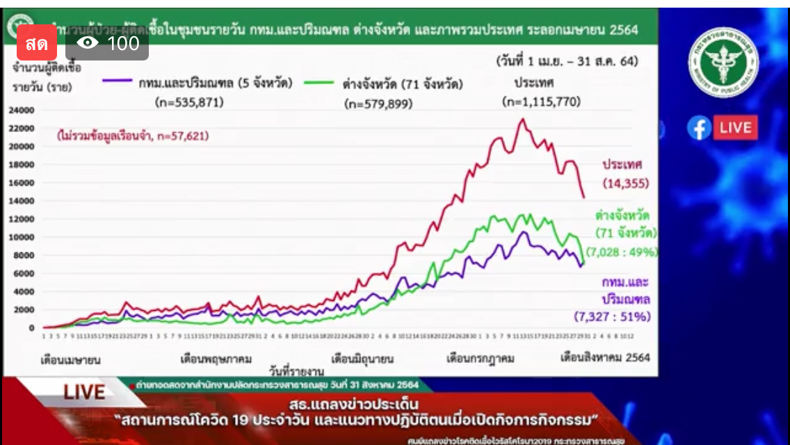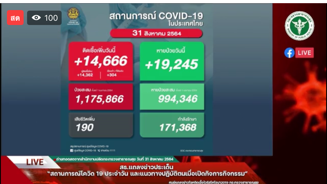 นพ.เฉวตสรร นามวาท ผู้อำนวยการกองควบคุมโรคและภัยสุขภาพในภาวะฉุกเฉิน กรมควบคุมโรค กระทรวงสาธารณสุข เปิดเผยว่า ในวันนี้ไทยมีตัวเลขผู้ติดเชื้อลดต่ำ ลงเป็นสัญญาณดีต่อเนื่อง ผู้เสียชีวิตก็เป็นวันแรกที่มีจำนวนต่ำกว่า 200ราย หลังจากตัวเลขเสียชีวิตเกิน 200 ราย มาตั้งแต่ 7ส.ค.ส่วนผู้หายป่วยก็มีจำนวนมากกว่าผู้ติดเชื้อ มาหลายวันแล้วและผู้หายป่วยก็จะมีจำนวนถึง 1ล้านคน