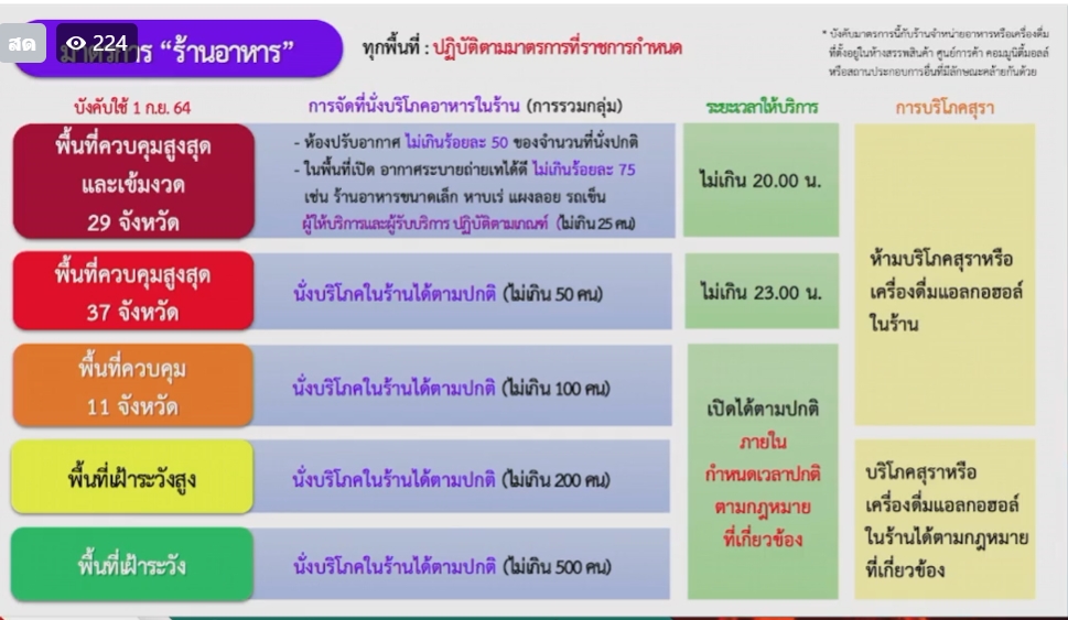 นพ.สุวรรณชัย วัฒนายิ่งเจริญชัย อธิบดีกรมอนามัย กระทรวงสาธารณสุข กล่าวว่า วันนี้ (1 ก.ย.) เป็นวันที่เริ่มต้นของการผ่อนปรนกิจกรรมและกิจการบางอย่าง โดยเฉพาะอย่างยิ่งการรับประทานอาหารภายในร้าน ในพื้นที่ที่กำหนดไว้เหมือนเดิม ทั้งพื้นที่สีแดงเข้ม พื้นที่ควบคุมสูงสุดและเข้มงวด 29 จังหวัด, พื้นที่สีแดง พื้นที่ควบคุมสูงสุด 37 จังหวัด และพื้นที่สีส้ม พื้นที่ควบคุม 11 จังหวัด โดยทั้ง 3 กลุ่มสีนี้ ห้ามดื่มเครื่องดื่มแอลกอฮอล์ภายในร้านอาหาร และห้ามรับประทานบุฟเฟต์