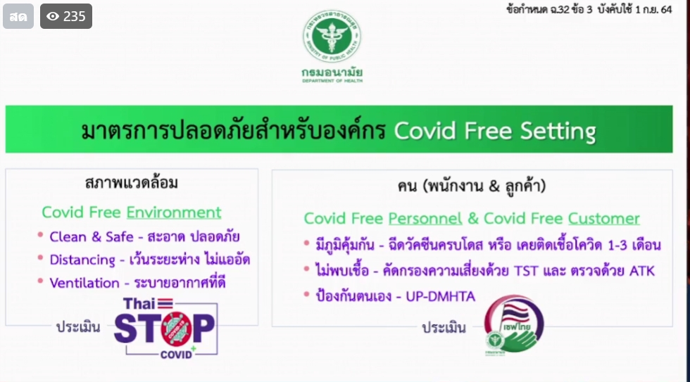นพ.สุวรรณชัย กล่าวย้ำว่า ทุกคนต้องปฏิบัติตามมาตรการป้องกันตนเองจากการติดเชื้อแบบครอบจักรวาล ทั้งสวมหน้ากากอนามัย มีระยะห่าง ล้างมือ ทำอย่างเคร่งครัด สำหรับการบังคับข้อกำหนดต่างๆ จะมีการประเมินผล 1 เดือน และเริ่มบังคับมาตรการต่างๆ 1 ตุลาคม 2564 ในส่วนของโควิด ฟรีเซตติ้ง (covid free setting) จะบังคับใช้กับร้านอาหารที่อยู่ในห้างสรรพสินค้า หรือมีเครื่องปรับอากาศ ปฏิบัติอย่างเคร่งครัด เน้นเรื่องทำความสะอาด ปลอดภัย มีระยะห่าง ไม่แออัด มีระบบระบายอากาศที่ดี มีการประเมินการจัดการสภาพแวดล้อมที่ดี ผ่านการประเมินจากแอปฯ Thai Stop COVID และยังครอบคลุมไปถึงผู้ให้บริการและผู้รับบริการอีกด้วย ทั้งการรับวัคซีนครบโดส หรือเคยมีประวัติติดเชื้อมา 1-3 เดือน และทำการคัดกรองความเสี่ยง ผ่าน ATK หรือ RT-PCR และต้องผ่านการประเมินผ่านแอปฯ Thai Save Thai