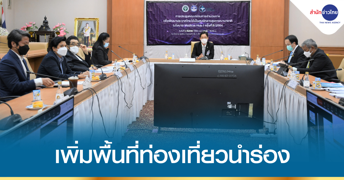คณะกรรมการอำนวยการเพื่อพัฒนาประเทศไทยให้เป็นศูนย์กลางสุขภาพนานาชาติ (Medical Hub) เห็นชอบการเตรียมเปิดประเทศและพื้นที่ท่องเที่ยวนำร่อง ตามที่รัฐบาลได้มีการประกาศไว้ และเพิ่มเติมอีก 4 จังหวัด รองรับการเปิดประเทศ เป็นศูนย์กลางการผลิตวัคซีน ศูนย์กลางการส่งเสริมสุขภาพ และศูนย์กลางสมุนไพร เตรียมจัดงานมหกรรมสินค้าและบริการสุขภาพ “Thailand International Health Expo 2022” ระหว่างวันที่ 20-23 มกราคม 2565 และการเป็นเจ้าภาพจัดงาน World Expo ระดับโลก
