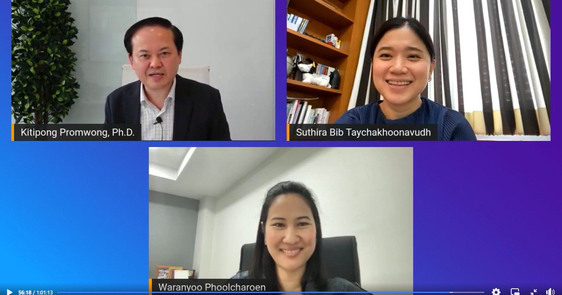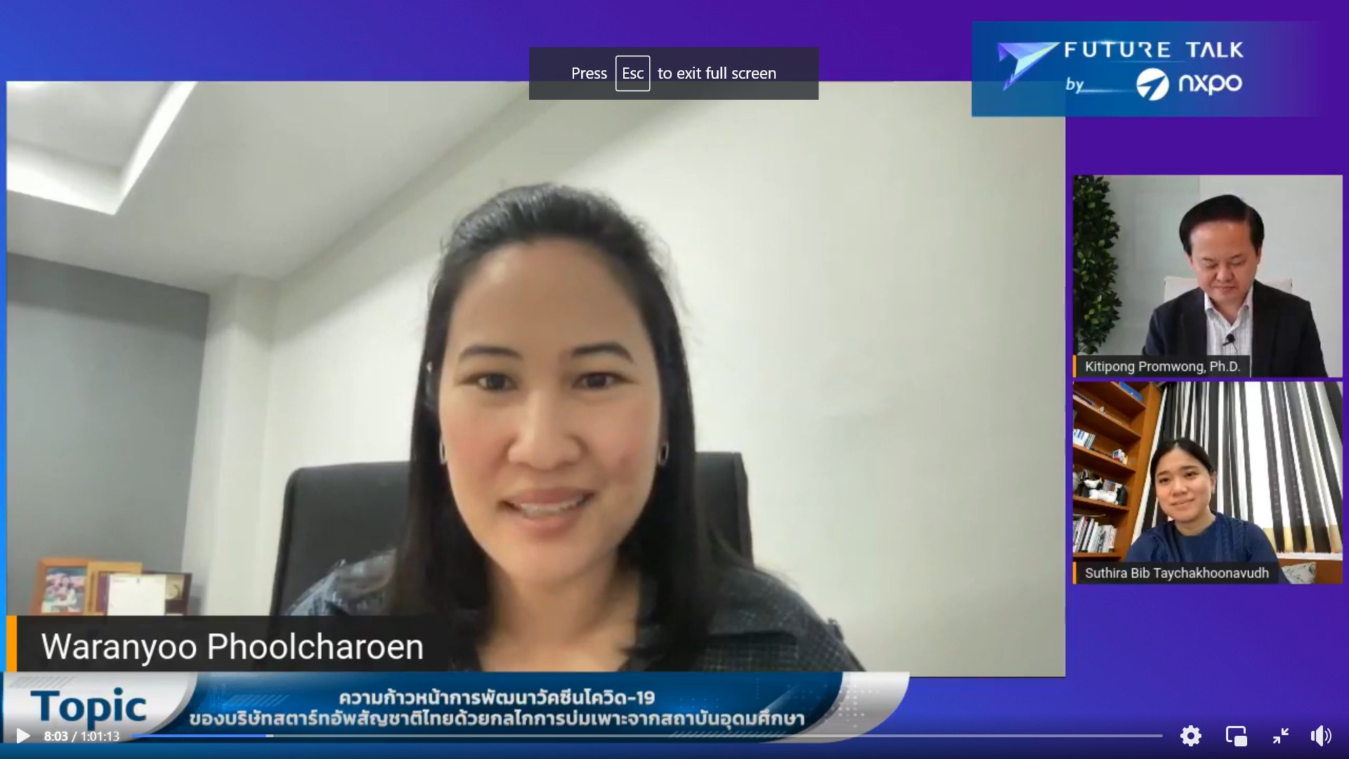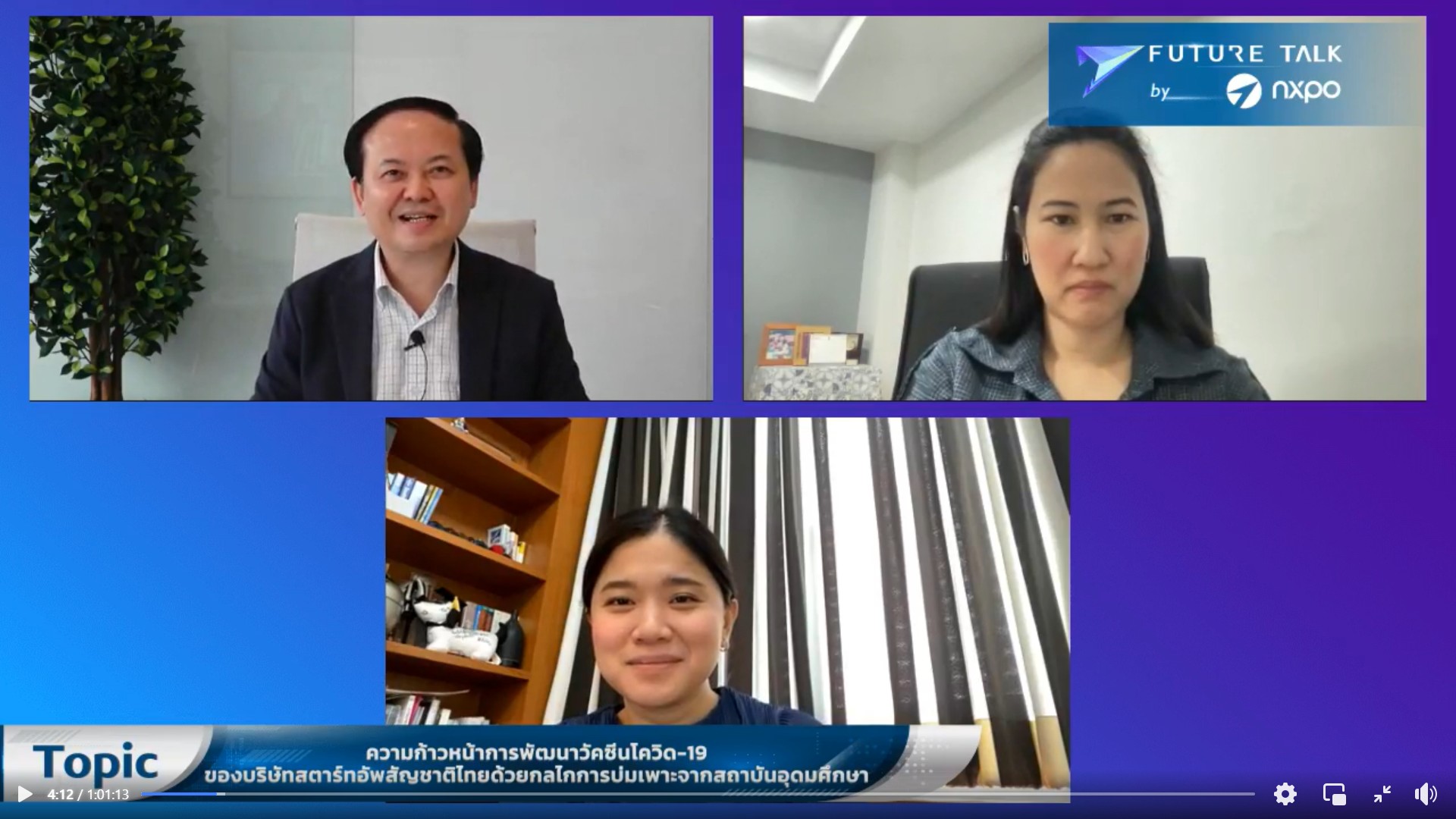 สำนักงานสภานโยบายการอุดมศึกษา วิทยาศาสตร์ วิจัยและนวัตกรรมแห่งชาติ (สอวช.) จัดรายการพูดคุยผ่านช่องทางออนไลน์ ถึงการเตรียมความพร้อมให้กับประเทศไทยรับมือกับเทรนด์การเปลี่ยนแปลงในอนาคต เพื่อมองหาและสร้างโอกาสให้กับประเทศผ่านการแลกเปลี่ยนมุมมองจากผู้เชี่ยวชาญและมีประสบการณ์ตรง ในประเด็น “ความก้าวหน้าการพัฒนาวัคซีนโควิด-19 ของบริษัทสตาร์ทอัพสัญชาติไทยด้วยกลไกการบ่มเพาะจากสถาบันอุดมศึกษา”โดยมี ผศ.ภญ.ดร.สุธีรา เตชคุณวุฒิ อาจารย์คณะเภสัชศาสตร์ จุฬาลงกรณ์มหาวิทยาลัย Co-founder และ CEO บริษัท ใบยา ไฟโตฟาร์ม จำกัด และ รศ.ดร.วรัญญู พูลเจริญ Co-founder และ Chief Technology Officer (CTO) บริษัท ใบยา ไฟโตฟาร์ม จำกัด ร่วมพูดคุย ดำเนินรายการโดย ดร.กิติพงค์ พร้อมวงค์ ผู้อำนวยการ สอวช.