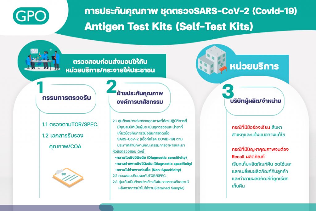 ทั้งนี้ก่อนนำชุดตรวจ ATK ไปจัดส่งให้หน่วยบริการต่าง ๆ นั้น องค์การฯจะตรวจรับสินค้าตาม TOR โดยตรวจประเมินจากใบตรวจวิเคราะห์ผลิตภัณฑ์ หรือเอกสารรับรองผลิตภัณฑ์ (COA) ว่ามีคุณภาพเป็นไปตาม TOR ของผู้สั่งซื้อ จากนั้นจะทำการสุ่มตัวอย่างไปทดสอบคุณภาพที่ห้องปฏิบัติการที่ได้มาตรฐานของคณะแพทย์ศาสตร์ โรงพยาบาลรามาธิบดี โดยทำการตรวจวิเคราะห์ในหัวข้อ ความไวเชิงวินิจฉัย (Diagnostic sensitivity) ความจำเพาะเชิงวินิจฉัย (Diagnostic specificity) ความไม่จำเพาะต่อเชื้อ (Non-Specificity) ตามเกณฑ์การทดสอบที่อย.กำหนด เมื่อผลการทดสอบคุณภาพผ่านก็จะกระจายผลิตภัณฑ์ไปสู่หน่วยบริการต่อไป