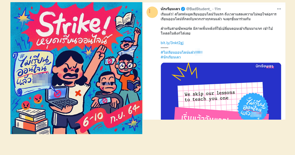 ทวิตเตอร์ “กลุ่มนักเรียนเลว” ทวิตข้อความพร้อมภาพประกอบ “เริ่มแล้ว! สไตรค์หยุดเรียนออนไลน์วันแรก ถึงเวลาแสดงความไม่พอใจต่อการเรียนออนไลน์ที่กดทับพวกเราทุกคนแล้ว จงลุกขึ้นมาร่วมกัน
