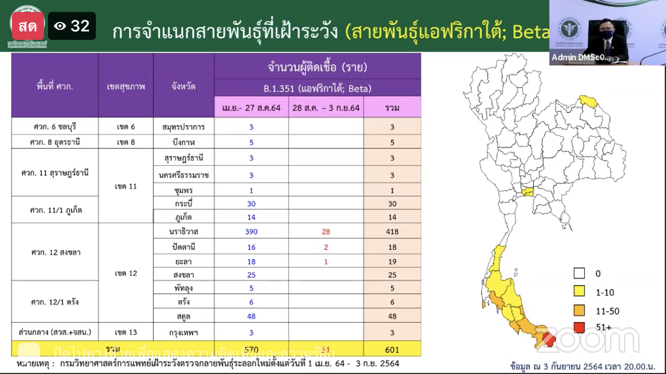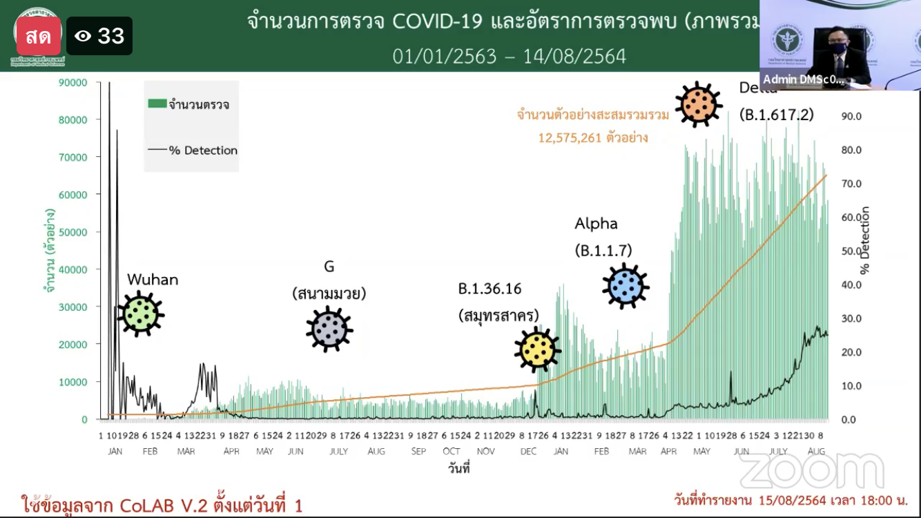 นพ.ศุภกิจ ศิริลักษณ์ อธิบดีกรมวิทยาศาสตร์การแพทย์ กล่าวถึงการเฝ้าระวังการกลายพันธุ์ของเชื้อไวรัสโควิด19 ในประเทศไทยว่า จากการติดตามสถานการณ์และสุ่มตรวจหาเชื้อจำนวน 1,523 ตัวอย่าง ระหว่างวันที่ 28 ส.ค.–3 ก.ย. 64 พบว่า เป็นสายพันธุ์ อัลฟา 75 คน ,เดลตา 1,417 คน และเบตา 31 คน ซึ่งหากมีการเปรียบเทียบสัดส่วนการแพร่ระบาดของแต่ละสายพันธุ์ จะพบว่าสายพันธุ์เดลตา เป็นสายพันนธุ์หลักของการระบาดในไทยขณะนี้คิดเป็นร้อยละ 93 ส่วนในพื้นที่ กทม.สายพันธุ์เดลตา มีสัดส่วนการระบาดถึงร้อยละ 97.6 พร้อมกล่าวว่า นับตั้งแต่มีการระบาดของโควิด กรมวิทยาศาสตร์การแพทย์มีการตรวจหาเชื้อโควิด-19 ด้วยวิธี RT-PCR ถึง 13 ล้านตัวอย่าง และยังมีนอกระบบในช่วงที่มีการระบาดหนัก อีกส่วนหนึ่ง คาดว่ามีการตรวจรวม 15 ล้านตัวอย่าง