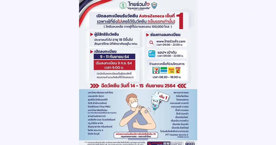 เพจเฟซบุ๊ก “ไทยร่วมใจ กรุงเทพฯปลอดภัย Safe Bangkok” โพสต์แจ้งเรื่อง การเปิดลงทะเบียนรับวัคซีน AstraZeneca เข็มที่ 1 เฉพาะผู้ที่ยังไม่เคยได้รับวัคซีน (วัคซีนคงเหลือจากผู้ที่ไม่มาแสดงตน 100,000 โดส) เริ่มลงทะเบียน 9 ก.ย.64 เวลา 09.00 น.ฉีดวัคซีนวันที่ 14-15 ก.ย.64 ที่หน่วยความร่วมมือ บริการฉีดวัคซีนโควิด-19 กรุงเทพมหานคร – หอการค้าไทย .-สำนักข่าวไทย