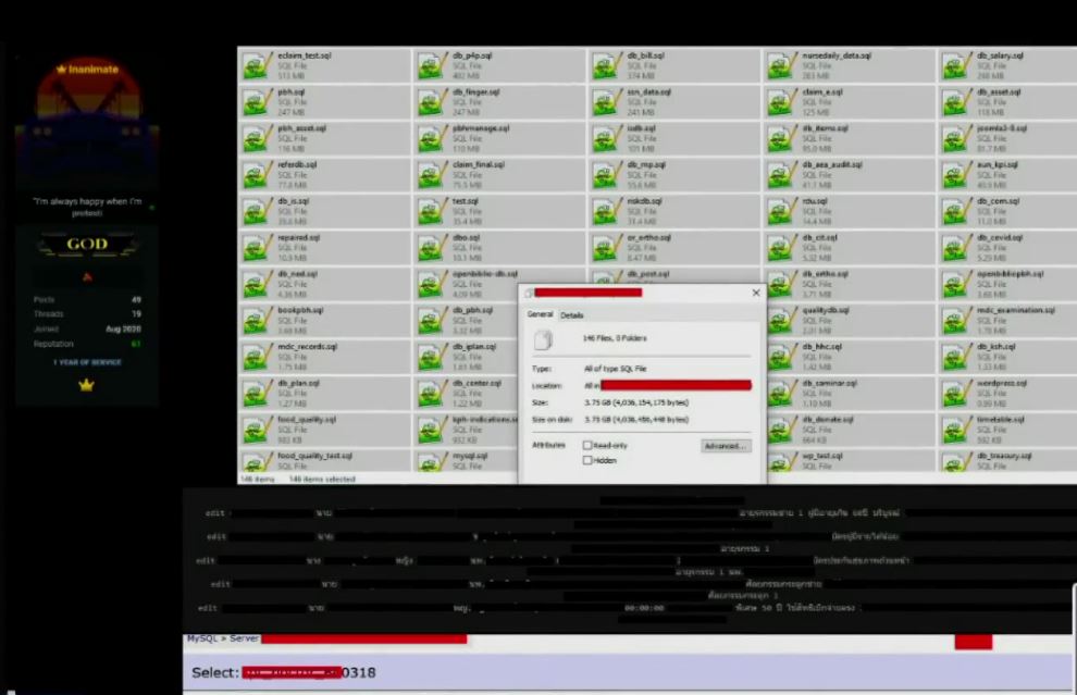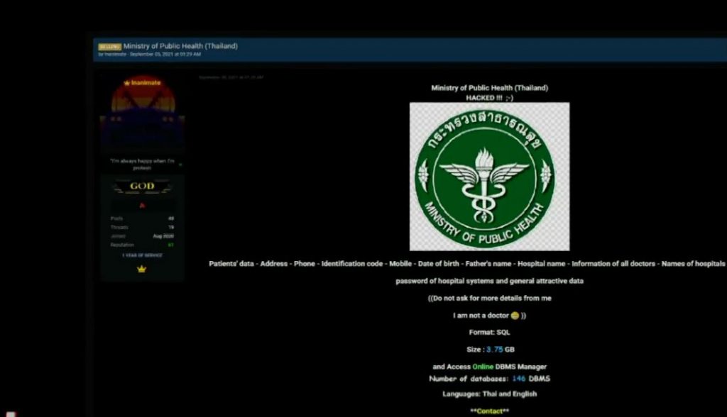 ส่วนผู้ใช้งานที่ชื่อว่า “Inanimate” เป็นผู้ประกาศขายฐานข้อมูลดังกล่าว ซึ่งอ้างว่าเป็นของกระทรวงสาธารณสุขของไทย ขนาดไฟล์ประมาณ 3.75 GB คิดราคาประมาณ 500 ดอลลาร์สหรัฐ หรือประมาณ 16,240 บาท โดยจะรับเฉพาะเงินสกุลดิจิทัล และให้ติดต่อผ่านกล่องข้อความ ประกาศขายเมื่อวันที่ 5 กันยายนที่ผ่านมา