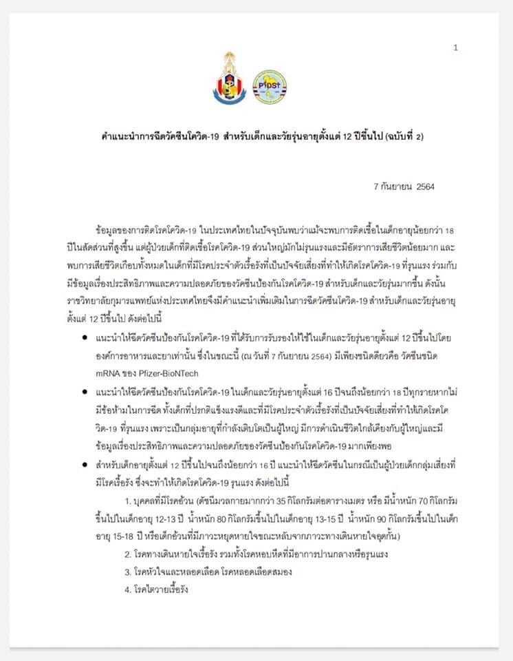 เพจเฟซบุ๊ก ราชวิทยาลัยกุมารแพทย์แห่งประเทศไทยและสมาคมกุมารแพทย์แห่งประเทศไทย โพสต์เผยแพร่ คำแนะนำการฉีดวัคซีนโควิด-19 สำหรับเด็กและวัยรุ่นอายุตั้งแต่ 12 ปีขึ้นไป (ฉบับที่ 2) วันที่ 7 กันยายน 2564 โดยมีรายละเอียดว่า