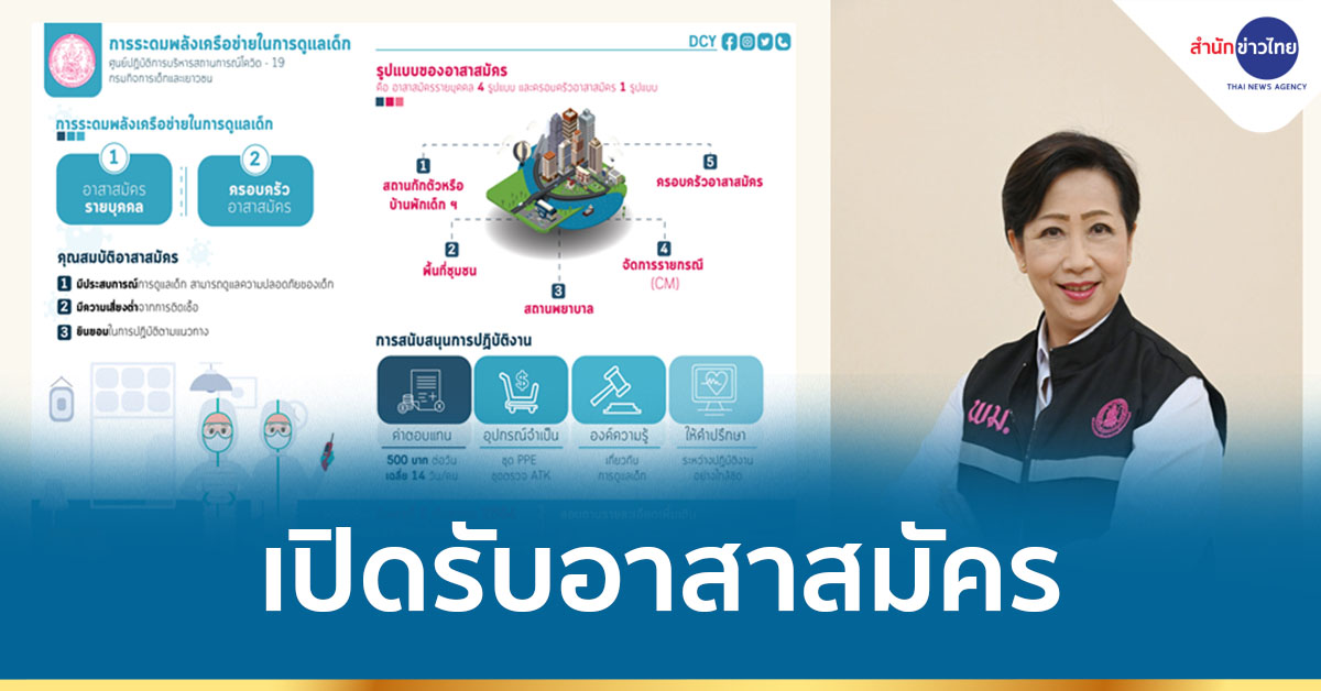 นางสุภัชชา สุทธิพล อธิบดีกรมกิจการเด็กและเยาวชน เปิดเผยว่า ศูนย์ช่วยเหลือเด็กโควิด-19 โดยความร่วมมือระหว่างกรมกิจการเด็กและเยาวชน กสศ. กรมสุขภาพจิต ยูนิเซฟ ระดมพลังเปิดรับเครือข่ายอาสาสมัครในการดูแลเด็ก แบ่งเป็นอาสาสมัครรายบุคคล และครอบครัวอาสาสมัคร โดยมีคุณสมบัติ ดังนี้