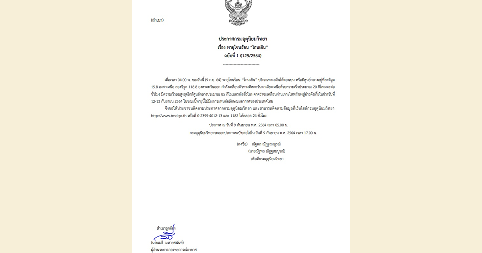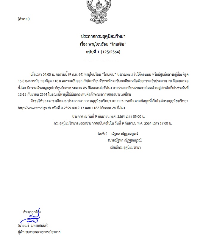 กรมอุตุนิยมวิทยา ออกประกาศกรมอุตุนิยมวิทยา “พายุโซนร้อนโกนเซิน” ฉบับที่1 ลงวันที่ 9 ก.ย.64 ลงชื่อโดยนายณัฐพล ณัฏฐสมบูรณ์ อธิบดีกรมอุตุนิยมวิทยา ว่า เมื่อเวลา 04.00 น.ของวันนี้ (9ก.ย.)พายุโซนร้อน “โกนเซิน” บริเวณทะเลจีนใต้ตอนบนหรือมีศูนย์กลางอยู่ที่ละติจูด15.8 องศาเหนือลองจิจูด 118.8 องศาตะวันออก กำลังเคลื่อนตัวทางทิศตะวันตกเฉียงเหนือด้วยความเร็ว 20 กิโลเมตรต่อชั่วโมง มีความเร็วลมสูงสุดใกล้ศูนย์กลางประมาณ 85 กิโลเมตรต่อชั่วโมง คาดว่าจะเคลื่อนผ่านเกาะไหหลำลงสู่อ่าวตังเกี๋ยในช่วงวันที่ 12-13 ก.ย.2564 ในขณะนี้ พายุนี้ไม่มีผลกระทบต่อลักษณะอากาศของประเทศไทย