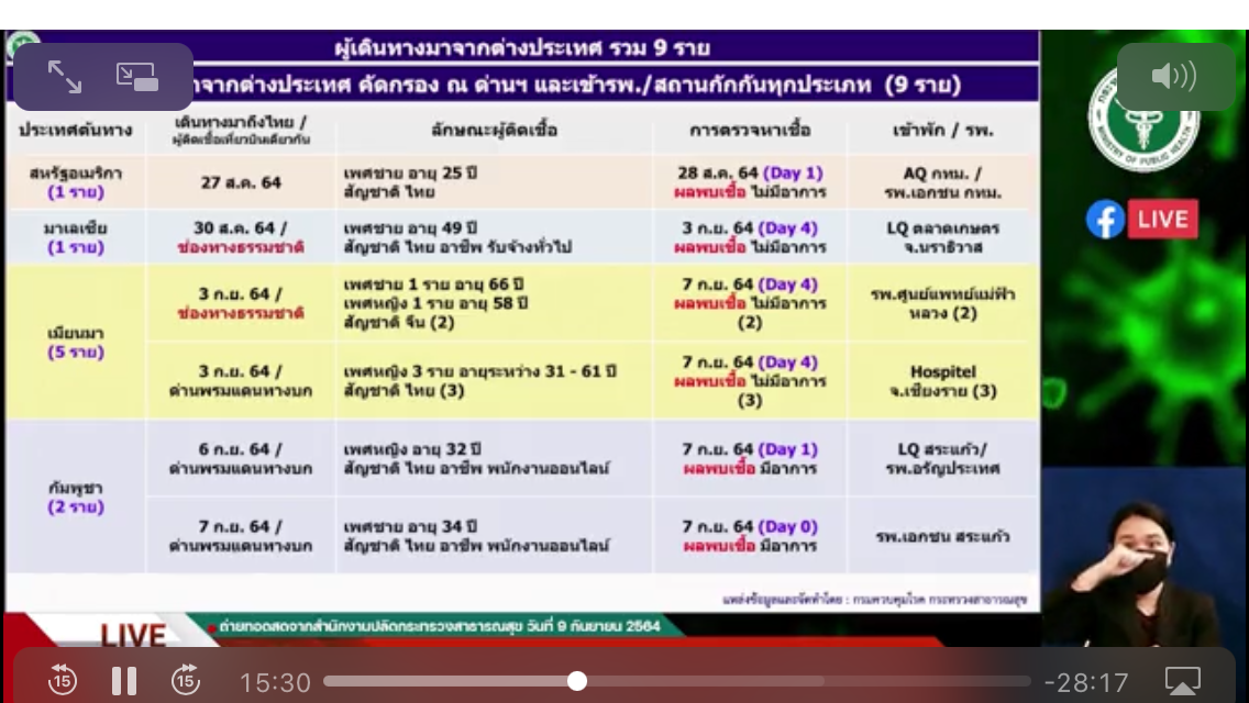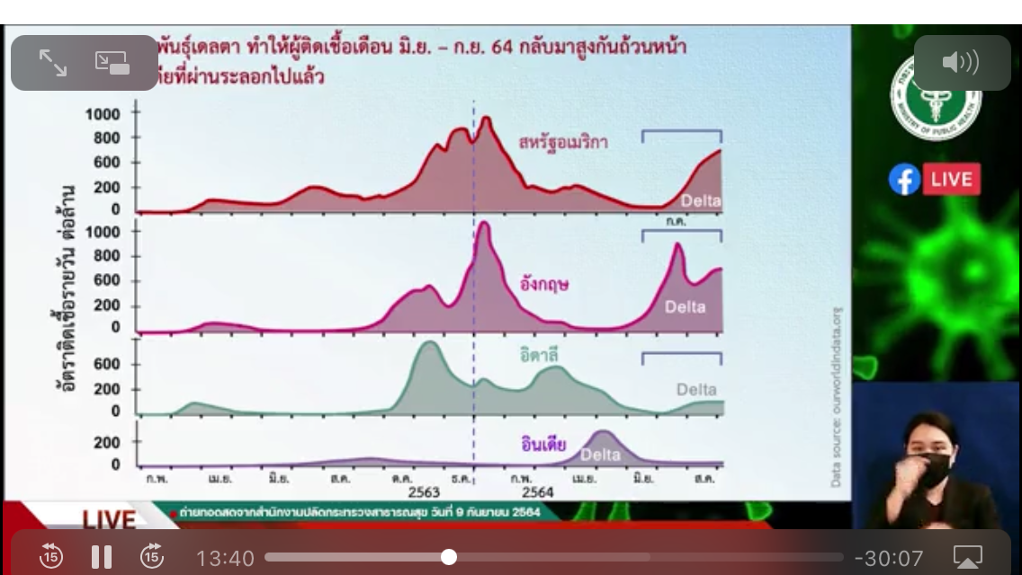 นพ.เฉวตสรร นามวาท ผู้อำนวยการกองควบคุมโรคและภัยสุขภาพในภาวะฉุกเฉิน กรมควบคุมโรค แถลงสถานการณ์โควิด-19 และวัคซีน ว่า ขณะนี้สายพันธุ์เดลตาที่มีอัตราการระบาดมากกว่าสายพันธุ์เดิมถึง 2.5 เท่า กำลังทำให้ผู้ติดเชื้อเดือน มิ.ย.-ก.ย.64 กลับมาสูงกันถ้วนหน้าในทุกประเทศ ทั้งสหรัฐอเมริกา อังกฤษ อิตาลี อินเดีย ซึ่งขณะนี้ไทยจับตามองผู้ติดเชื้อเดินทางมาจากต่างประเทศ และเข้มงวดกวดขันชายแดนตลอดเวลา ถึงแม้ว่าเรายังไม่พบสายพันธุ์ C.1.2 หรือมิว ก็ตาม
