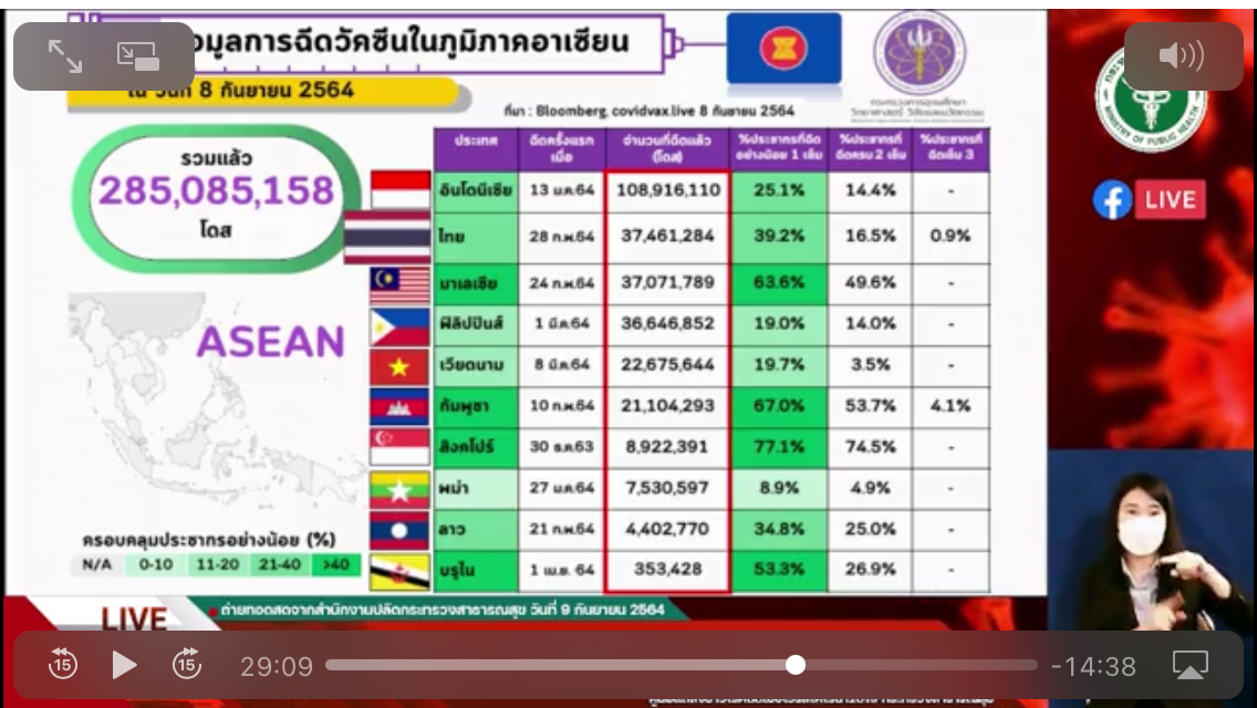 สรุปผลการฉีดวัคซีนโควิด-19 จนถึง 8 ก.ย.64 ยอดรวมการฉีดสะสมกว่า 38 ล้านโดส ส่วนความครอบคลุมการได้รับบริการวัคซีนในพื้นที่สีแดงเข้ม 29 จังหวัด ฉีดไปแล้ว 50.4% ของประชากร โดยเฉพาะกรุงเทพฯ ฉีดไปแล้ว 94.2% ไทยขึ้นเป็นอันดับ 2 ของอาเซียน รองจากอินโดนีเซีย ที่ประชาชนได้รับการฉีดวัคซีนมาก