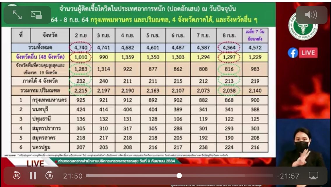 สำหรับยอดผู้ติดเชื้อรายใหม่ 16,031 ราย อาจทำให้วิตกว่าจะเป็นการเพิ่มจำนวนผู้ติดเชื้อหรือไม่นั้น แต่ความเป็นจริงต้องดูค่าเฉลี่ยใน 7 วันย้อนหลัง ซึ่งนับจากการคลายล็อก 1 ก.ย.64 กรมควบคุมโรคได้เฝ้าระวังอยู่ตลอดเวลา และขณะนี้ยังไม่ครบ 14 วัน หลังคลายล็อก ซึ่งจะต้องประเมินตัวเลขอีกครั้ง เช่นเดียวกับยอดผู้เสียชีวิตและยอดผู้หายป่วย เมื่อดูกราฟแนวโน้มเพิ่มขึ้นเล็กน้อย แต่ต้องดูภาพรวมวันพรุ่งนี้ว่าตัวเลขจะเพิ่มหรือลด เมื่อแยกรายจังหวัดพบกรุงเทพฯ และปริมณฑล ลดลง แต่เพิ่มในต่างจังหวัด