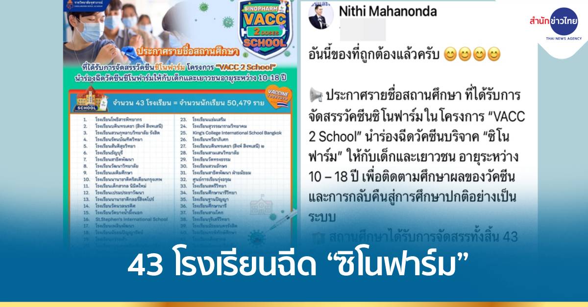 ศ.นพ.นิธิ มหานนท์ เลขาธิการราชวิทยาลัยจุฬาภรณ์ โพสต์เฟซบุ๊ก Nithi Mahanonda เรื่องการประกาศรายชื่อสถานศึกษา ที่ได้รับการจัดสรรวัคซีนซิโนฟาร์มในโครงการ “VACC 2 School” นำร่องฉีดวัคซีนบริจาค “ซิโนฟาร์ม” ให้กับเด็กและเยาวชน อายุระหว่าง 10 – 18 ปี เพื่อติดตามศึกษาผลของวัคซีนและการกลับคืนสู่การศึกษาปกติอย่างเป็นระบบ