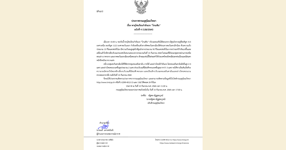 ประกาศ ณ วันที่ 10 กันยายน พ.ศ. 2564 เวลา 11.00 น. กรมอุตุนิยมวิทยาจะออกประกาศฉบับต่อไป ในวันที่ 10 กันยายน พ.ศ. 2564 เวลา 17.00 น.-สำนักข่าวไทย