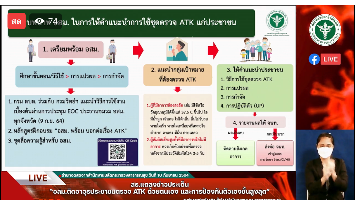 ด้านรองอธิบดีกรม สบส. กล่าวว่า อสม.จะเข้าไปทำหน้าที่ให้คำแนะนำการใช้ชุดตรวจ ATK แก่ประชาชน เมื่อตรวจพบผลบวกก็จะแนะนำ ช่วยประสานเจ้าหน้าที่ รพ.สต. หรือโรงพยาบาล ให้ได้รับการรักษาแบบกักตัวที่บ้าน หรือศูนย์พักคอย เบื้องต้น สบส.ได้ประสานศูนย์สนับสนุนบริการสุขภาพเขตทุกจังหวัด ให้อบรมความรู้เบื้องต้นในการตรวจ ATK ด้วยตัวเองกับประชาชน ส่งผ่านความรู้ด้วยคลิปวิดีโอผ่านกลุ่ม LINE ประชาชนสามารถเรียนรู้ได้ตลอดเวลา