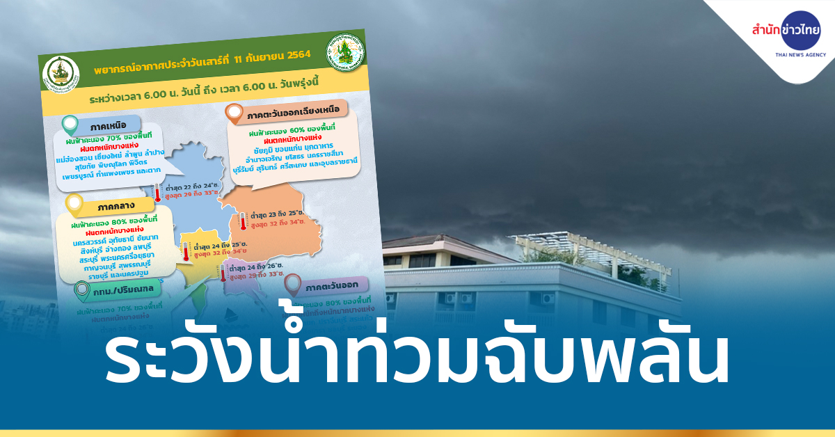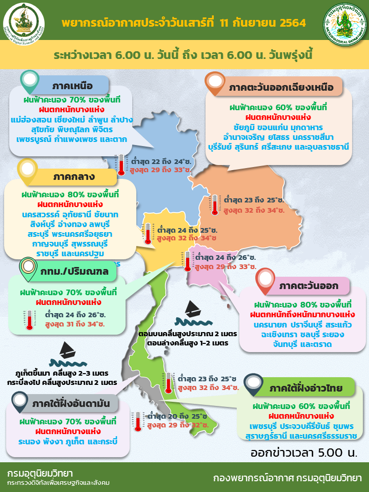 กรมอุตุนิยมวิทยารายงานบริเวณประเทศไทยยังคงมีฝนตกต่อเนื่อง กับมีฝนตกหนักบางแห่งในภาคเหนือ ภาคตะวันออกเฉียงเหนือ ภาคกลาง ภาคตะวันออก และภาคใต้ ขอให้ประชาชนที่อาศัยอยู่ในพื้นที่เสี่ยงภัยบริเวณดังกล่าว ระวังอันตรายจากฝนตกหนักและฝนตกสะสมซึ่งอาจทำให้เกิดน้ำท่วมฉับพลันและน้ำป่าไหลหลากไว้ด้วย สำหรับคลื่นลมบริเวณทะเลอันดามันและอ่าวไทยมีกำลังแรงขึ้น โดยทะเลอันดามันมีคลื่นสูง 2-3 เมตร และอ่าวไทยตอนบนคลื่นสูงประมาณ 2 เมตร ส่วนบริเวณที่มีฝนฟ้าคะนองคลื่นสูงมากกว่า 3 เมตร ขอให้ชาวเรือเดินเรือด้วยความระมัดระวังโดยหลีกเลี่ยงบริเวณที่มีฝนฟ้าคะนอง และเรือเล็กบริเวณทะเลอันดามันและอ่าวไทยตอนบนควรงดออกจากฝั่ง จนถึงวันที่ 14 กันยายน 2564