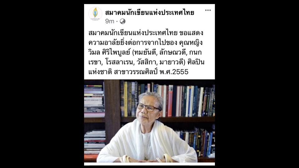 เพจเฟซบุ๊ก “สมาคมนักเขียนแห่งประเทศไทย” โพสต์สมาคมนักเขียนแห่งประเทศไทย ขอแสดงความอาลัยยิ่งต่อการจากไปของ คุณหญิงวิมล ศิริไพบูลย์ (ทมยันตี, ลักษณวดี, กนกเรขา, โรสลาเรน, มายาวดี) ศิลปินแห่งชาติ สาขาวรรณศิลป์ พ.ศ.2555