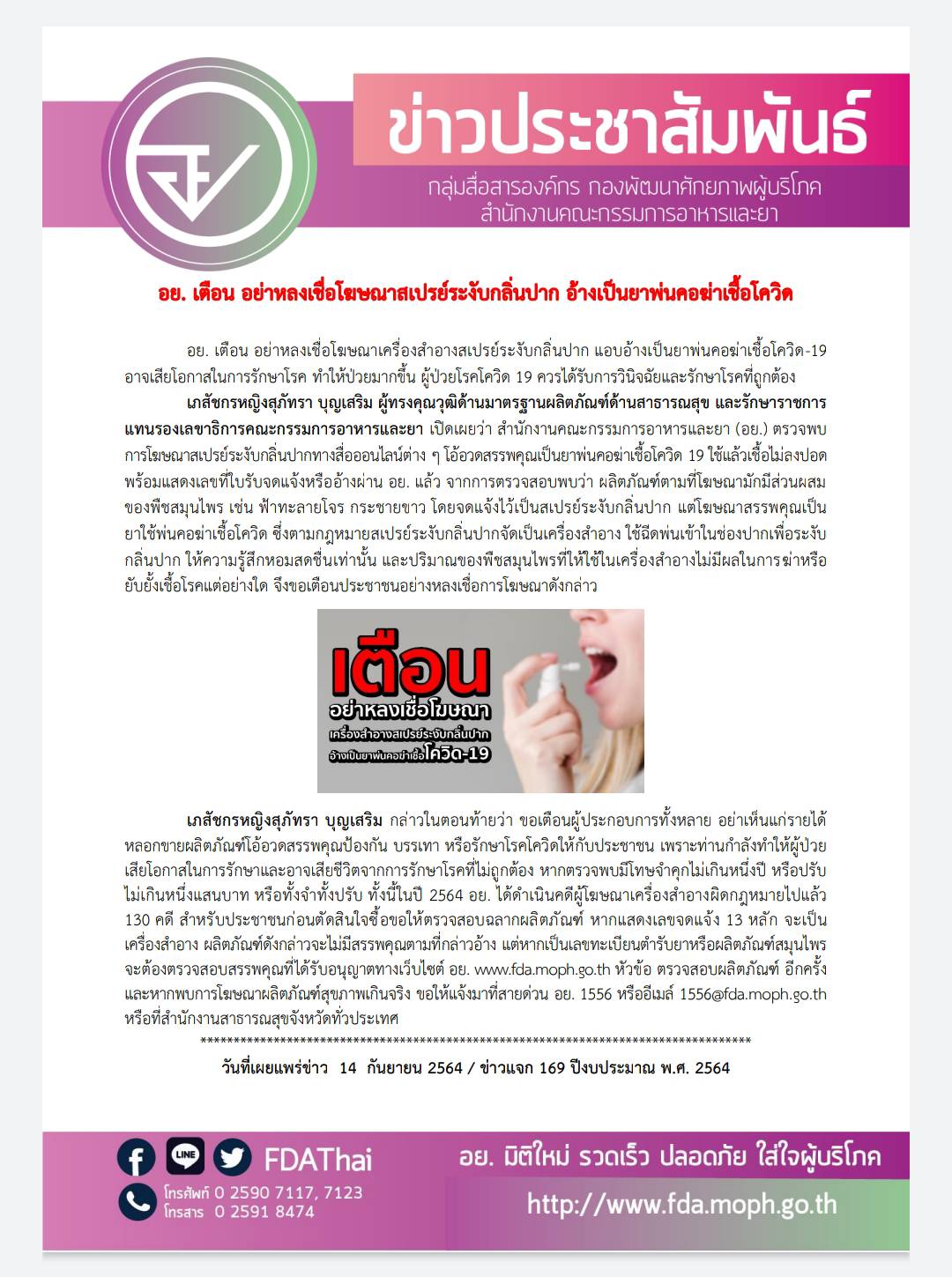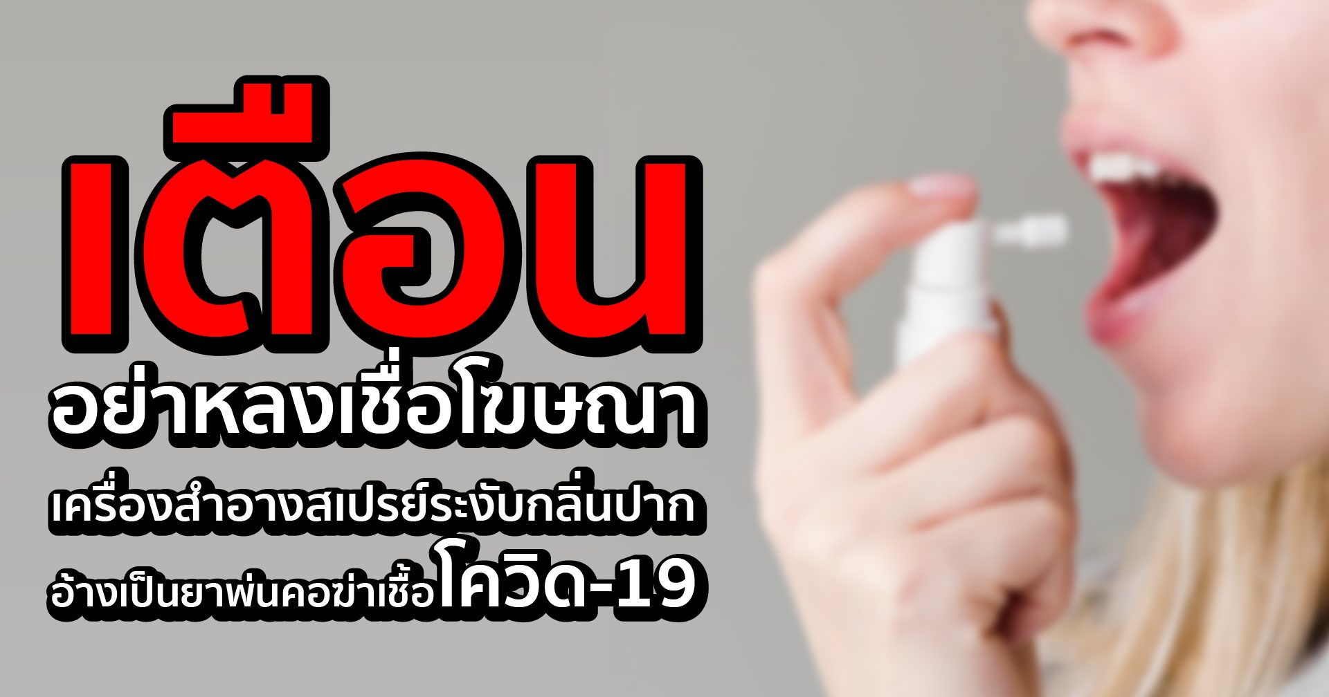เภสัชกรหญิงสุภัทรา บุญเสริม ผู้ทรงคุณวุฒิด้านมาตรฐานผลิตภัณฑ์ด้านสาธารณสุข และรักษาราชการแทนรองเลขาธิการคณะกรรมการอาหารและยา เปิดเผยว่า สำนักงานคณะกรรมการอาหารและยา (อย.) ตรวจพบการโฆษณาสเปรย์ระงับกลิ่นปากทางสื่อออนไลน์ต่างๆ โอ้อวดสรรพคุณเป็นยาพ่นคอฆ่าเชื้อโควิด-19 ใช้แล้วเชื้อไม่ลงปอด พร้อมแสดงเลขที่ใบรับจดแจ้งหรืออ้างผ่าน อย.แล้ว จากการตรวจสอบพบว่า ผลิตภัณฑ์ตามที่โฆษณามักมีส่วนผสมของพืชสมุนไพร เช่น ฟ้าทะลายโจร กระชายขาว โดยจดแจ้งไว้เป็นสเปรย์ระงับกลิ่นปาก แต่โฆษณาสรรพคุณเป็นยาใช้พ่นคอฆ่าเชื้อโควิด ซึ่งตามกฎหมายสเปรย์ระงับกลิ่นปากจัดเป็นเครื่องสำอาง ใช้ฉีดพ่นเข้าในช่องปากเพื่อระงับกลิ่นปาก ให้ความรู้สึกหอมสดชื่นเท่านั้น และปริมาณของพืชสมุนไพรที่ให้ใช้ในเครื่องสำอางไม่มีผลในการฆ่าหรือยับยั้งเชื้อโรคแต่อย่างใด จึงขอเตือนประชาชนอย่าหลงเชื่อการโฆษณาดังกล่าว