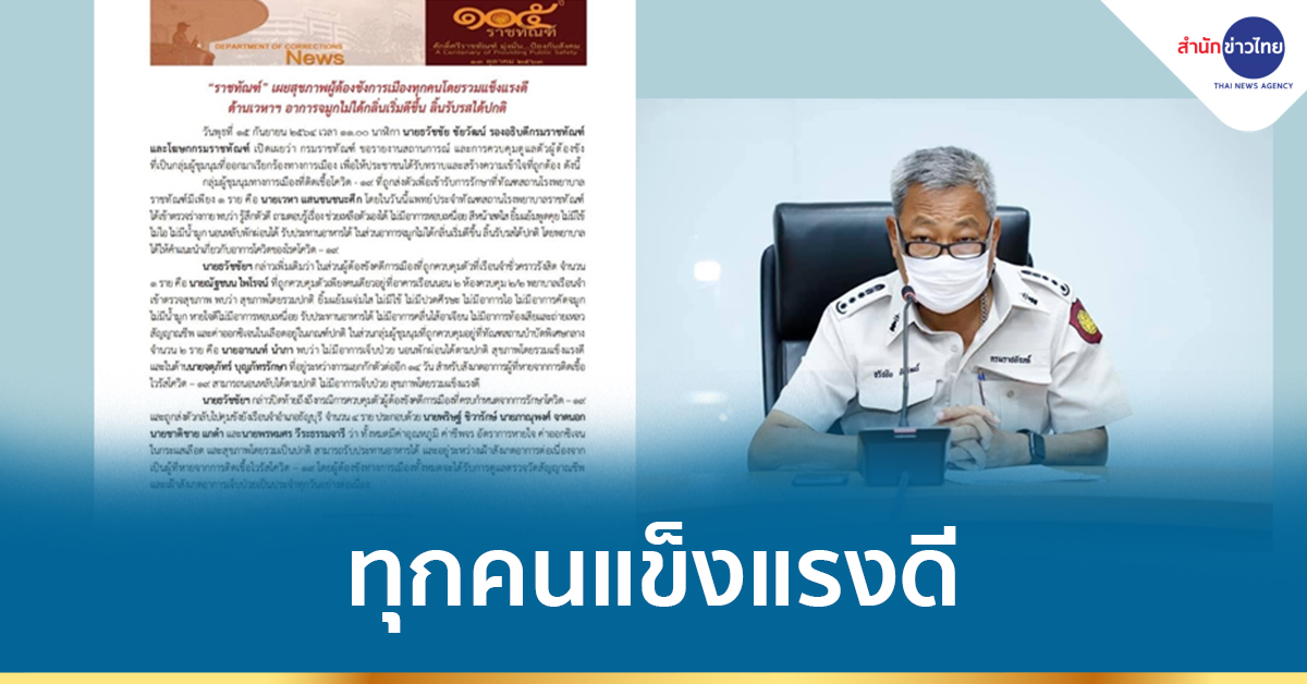 นายธวัชชัย ยังกล่าวถึงกรณีการควบคุมตัวผู้ต้องขังคดีการเมืองที่ครบกำหนดจากการรักษาโควิด และถูกส่งตัวกลับไปคุมขังยังเรือนจำอำเภอธัญบุรี จำนวน 4 ราย ประกอบด้วย นายพริษฐ์ ชิวารักษ์ นายภาณุพงศ์ จาดนอก นายชาติชาย แกดำ และนายพรหมศร วีระธรรมจารี ว่า ทั้งหมดมีค่าอุณหภูมิ ค่าชีพจร อัตราการหายใจ ค่าออกซิเจน ในกระแสเลือด และสุขภาพโดยรวมเป็นปกติ รับประทานอาหารได้ และอยู่ ระหว่างฝ้าสังเกตอาการต่อเนื่องจากเป็นผู้ที่หายจากการติดเชื้อไวรัสโควิด โดยผู้ต้องขังทางการเมืองทั้งหมดจะได้รับการดูแลตรวจวัดสัญญาณชีพ และเฝ้าสังเกตอาการเจ็บป่วยเป็นประจำทุกวันอย่างต่อเนื่อง .-สำนักข่าวไทย
