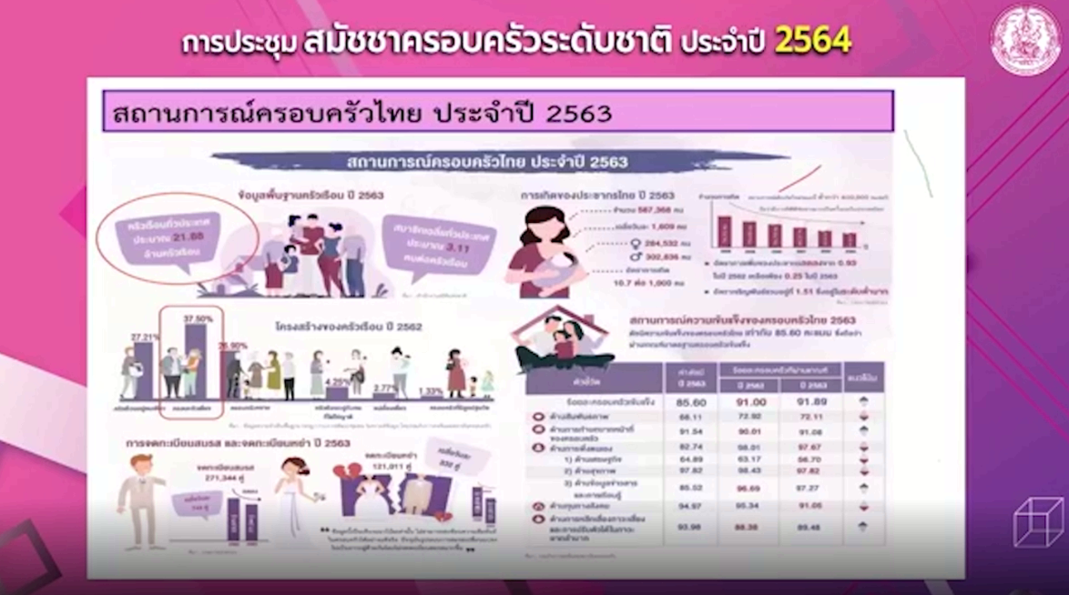 ที่กระทรวงการพัฒนาสังคมและความมั่นคงของมนุษย์ หรือ พม. สะพานขาว ถนนกรุงเกษม กทม. นางพัชรี อาระยะกุล ปลัด พม. เป็นประธานเปิดการประชุมสมัชชาครอบครัวระดับชาติ ประจำปี 2564 ภายใต้แนวคิด “ครอบครัวไทยกับการสร้างสมดุลในวิถีชีวิตใหม่” ผ่านสื่ออิเลกทรอนิกส์ในรูปแบบ Virtual Event Online เพื่อทบทวนปัญหา รับฟังความคิดเห็น ข้อเสนอแนะ แนวทางการดำเนินงานด้านครอบครัวในทุกระดับ และรวบรวมเป็นข้อเสนอเชิงนโยบายที่สอดคล้องกับบริบทของสังคมไทย อันนำไปสู่การกำหนดนโยบายและแนวทางในการส่งเสริมและพัฒนาครอบครัว ตลอดจนส่งเสริมความเข้มแข็งของสถาบันครอบครัวได้อย่างมีประสิทธิภาพและเป็นรูปธรรม โดยมีนางจินตนา จันทร์บำรุง อธิบดีกรมกิจการสตรีและสถาบันครอบครัว กล่าวรายงาน ร่วมด้วยผู้ทรงคุณวุฒิในคณะกรรมการนโยบายและยุทธศาสตร์ครอบครัวแห่งชาติ คณะอนุกรรมการส่งเสริมและพัฒนาครอบครัวจังหวัดและกรุงเทพมหานคร รวมทั้งเจ้าหน้าที่หน่วยงานที่เกี่ยวข้องทั้งภาครัฐและเอกชน ผู้บริหารและเจ้าหน้าที่กรมกิจการสตรีและสถาบันครอบครัว รวมกว่า 300 คน เข้าร่วมประชุมผ่านสื่อในครั้งนี้