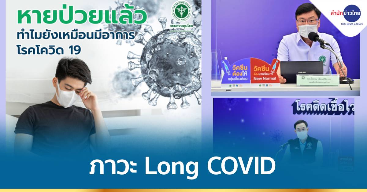 นพ.โสภณ เอี่ยมศิริถาวร รองอธิบดีกรมควบคุมโรค กระทรวงสาธารณสุข กล่าวว่า ขณะนี้แนวโน้มผู้ป่วยโควิด19 ที่รักษาหายรายวันมีจำนวนเพิ่มขึ้น สูงกว่าผู้ติดเชื้อรายใหม่ สะท้อนถึงคุณภาพระบบการดูแลรักษา ยอดผู้ป่วยสะสมตั้งแต่วันที่ 1 เม.ย.64 จนถึงวันนี้รวม 1,405,374 ราย หลายรายแม้จะหายป่วยและตรวจไม่พบเชื้อไวรัสในร่างกายแล้วอาจจะยังมีอาการหลงเหลืออยู่ องค์การอนามัยโลก(World Health Organization : WHO)เรียกอาการที่เกิดขึ้นนี้ว่า “ภาวะลอง โควิด” (Long COVID)หรืออาการหลงเหลือของเชื้อโควิด 19 ระยะยาว ซึ่งสามารถพบภาวะนี้ได้ทั่วโลก ส่วนใหญ่จะมีอาการหลังจากหายป่วยในช่วง 1-3 เดือนแรก พบได้ร้อยละ 30-50 ของผู้ป่วยโรคโควิด 19 จึงไม่ต้องตกใจหรือกังวลใจแต่อย่างใด