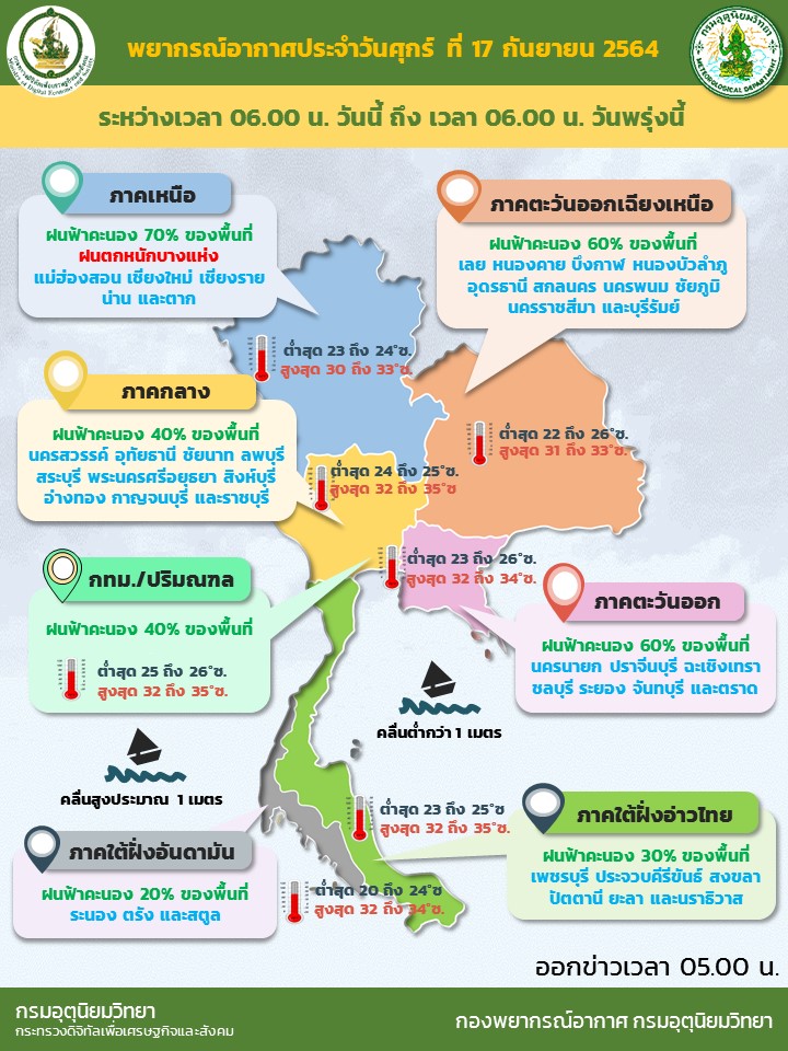 กรมอุตุนิยมวิทยา พยากรณ์อากาศ 24 ชั่วโมงข้างหน้า ร่องมรสุมพาดผ่านภาคเหนือ และภาคตะวันออกเฉียงเหนือตอนบน ประกอบกับมรสุมตะวันตกเฉียงใต้ที่พัดปกคลุมทะเลอันดามัน ภาคใต้ และอ่าวไทย มีกำลังอ่อนลง ลักษณะเช่นนี้ทำให้บริเวณประเทศไทยมีฝนลดลง แต่ยังคงมีฝนฟ้าคะนองเกิดขึ้นได้บางพื้นที่ โดยมีฝนตกหนักบางแห่งในภาคเหนือ ส่วนคลื่นลมบริเวณทะเลอันดามันและอ่าวไทยมีกำลังอ่อนลง โดยทะเลอันดามันมีคลื่นสูงประมาณ 1 เมตร และอ่าวไทยมีคลื่นต่ำกว่า 1 เมตร ส่วนบริเวณที่มีฝนฟ้าคะนอง คลื่นสูง 1-2 เมตร ขอให้ชาวเรือเดินเรือด้วยความระมัดระวัง และควรหลีกเลี่ยงการเดินเรือบริเวณที่มีฝนฟ้าคะนองไว้ด้วย