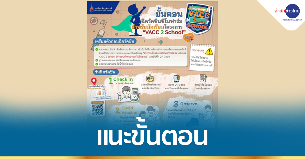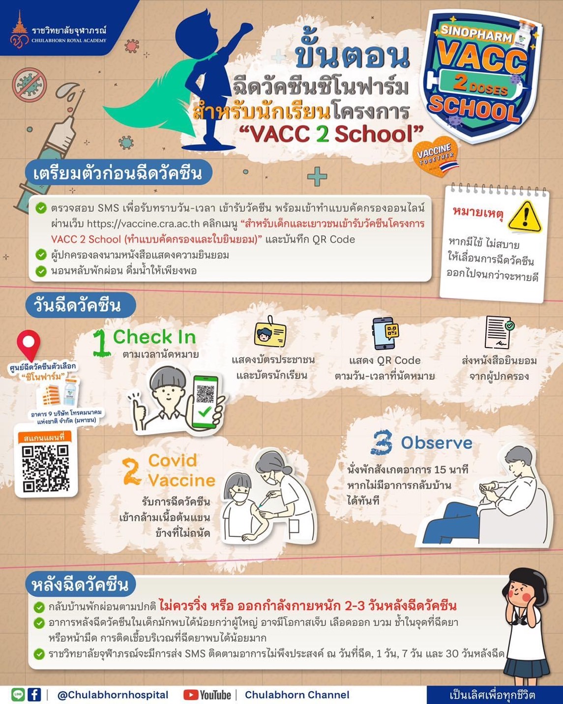 ศูนย์ข้อมูลราชวิทยาลัยจุฬาภรณ์ โพสต์แจ้งประชาสัมพันธ์การเตรียมตัวและขั้นตอนการเข้ารับบริการฉีดวัคซีนซิโนฟาร์มสำหรับนักเรียนและผู้ปกครองที่เข้าร่วมโครงการ “VACC 2 School” ซึ่งจะเริ่มฉีด 20 กันยายน 2564 นี้