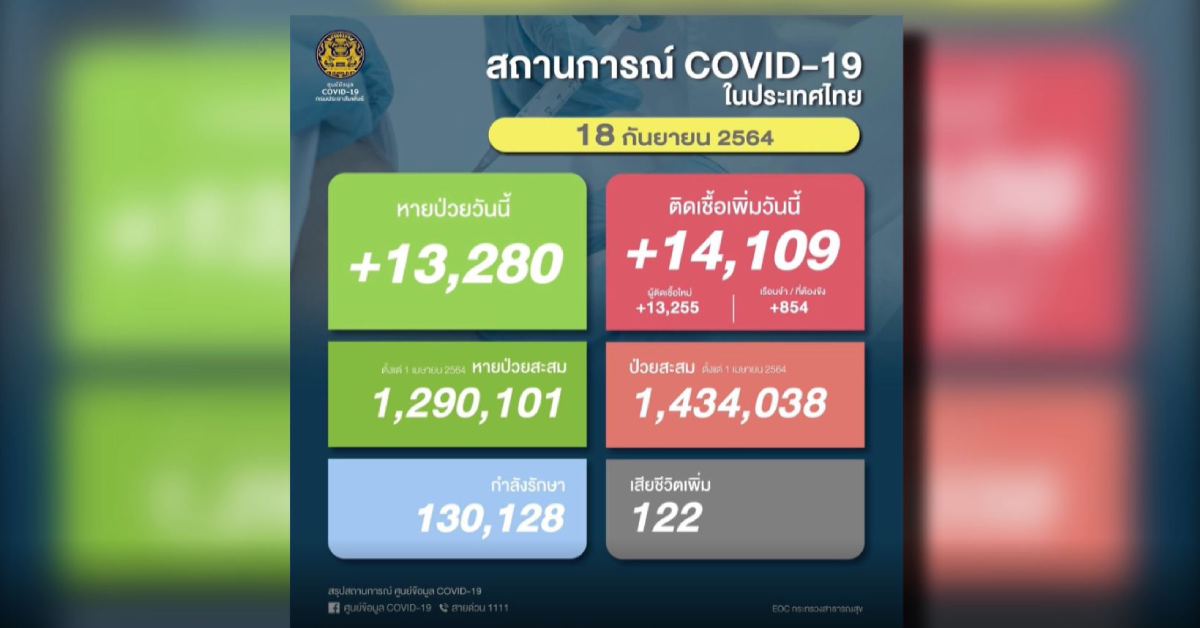 กรุงเทพฯ 18 ก.ย.-ยังต้องจับตาการระบาดของโควิด-19 วันนี้ ศบค. รายงานตัวเลขติดเชื้อรายใหม่เพิ่ม 14,109 คน เสียชีวิตเพิ่มอีก 122 คน
