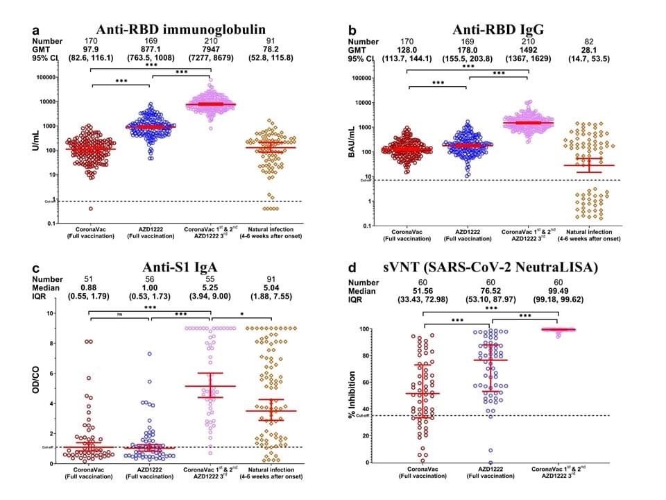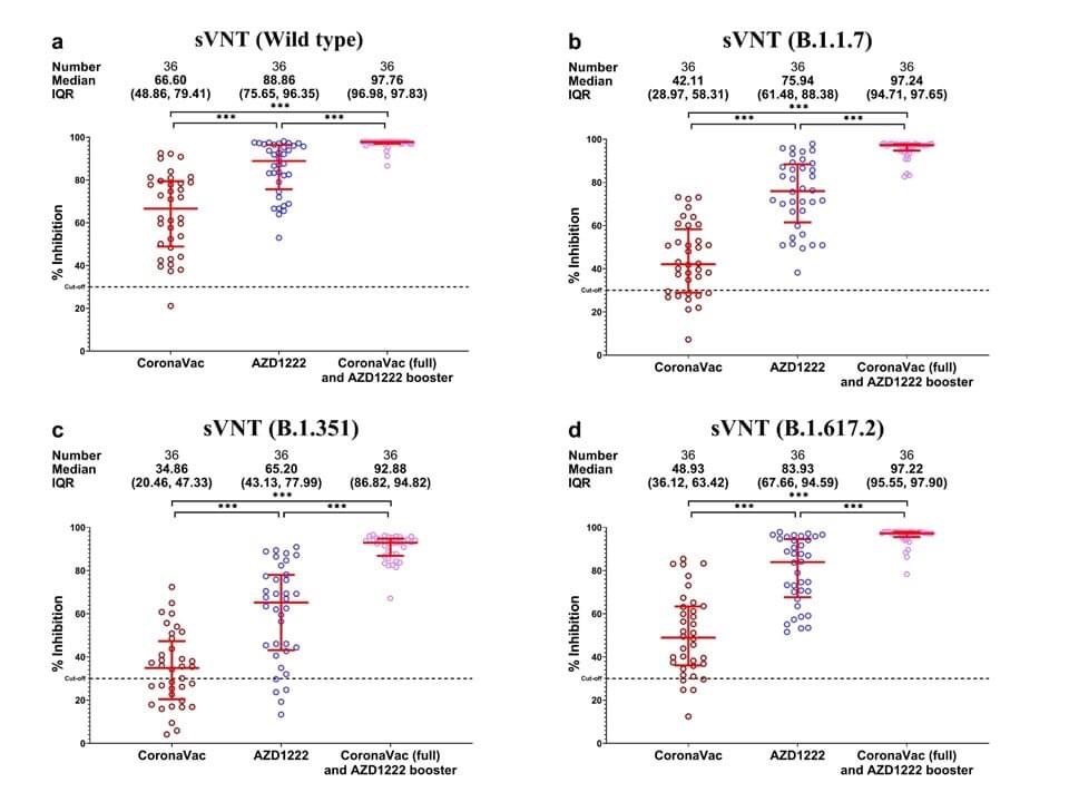 การกระตุ้นเข็ม 3 ด้วย AstraZeneca หลังจากได้รับ Sinovac มาแล้ว 2 เข็ม ภูมิต้านทานสูงมาก และขัดขวางสายพันธุ์เดลตาในการทดลอง และ มีระดับภูมิต้านทาน IgA ในเลือดสูงกว่าการให้เบื้องต้นอย่างมาก