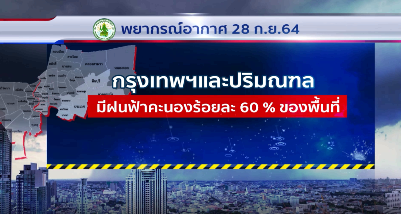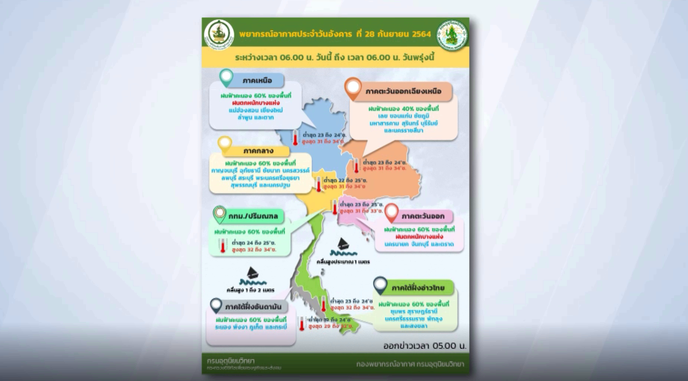กรุงเทพฯ 28 ก.ย.- กรมอุตุนิยมวิทยา พยากรณ์อากาศถึงเช้าวันพรุ่งนี้ (29 ก.ย.) ไทยมีฝนลดลง แต่ยังคงตกหนักบางพื้นที่ในภาคเหนือ และภาคตะวันออก ขอให้ประชาชนในพื้นที่เสี่ยงภัยระวังอันตรายจากฝนตกหนักและฝนที่ตกสะสม ซึ่งอาจทำให้เกิดน้ำท่วมฉับพลันและน้ำป่าไหลหลากในระยะนี้