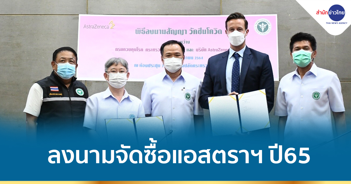นายอนุทิน ชาญวีรกูล รองนายกรัฐมนตรี และรัฐมนตรีว่าการกระทรวงสาธารณสุข, นายแพทย์โอภาส การย์กวินพงษ์ อธิบดีกรมควบคุมโรค และผู้บริหารกระทรวง ได้ร่วมพิธีเซ็นสัญญาจัดหาวัคซีนโควิด-19 กับตัวแทนบริษัท แอสตราเซเนกา (ประเทศไทย) จำกัด โดยการลงนามครั้งนี้ เป็นการจัดหาวัคซีนไว้ สำหรับบริการประชาชนในปี 2565 เพื่อเป็นวัคซีนบูสเตอร์โดส เข็มที่ 3 ให้กับประชาชน ซึ่งทางผู้ผลิต ต้องส่งให้ไทย 60 ล้านโดส ในไตรมาส 1 จำนวน 15 ล้านโดส,ไตรมาส 2 จำนวน 30 ล้านโดส และไตรมาส 3 จำนวน 15 ล้านโดส และระหว่างการส่งมอบตามสัญญา หากทางบริษัท แอสตราฯ เกิดประสบความสำเร็จ ในการศึกษาวัคซีนเจนเนอเรชันที่ 2 ก็ต้องให้ไทย ได้มีทางเลือกในเปลี่ยนตัววัคซีนด้วยเช่นกัน ทั้งนี้ ใช้งบประมาณ 1.8 หมื่นล้านบาท