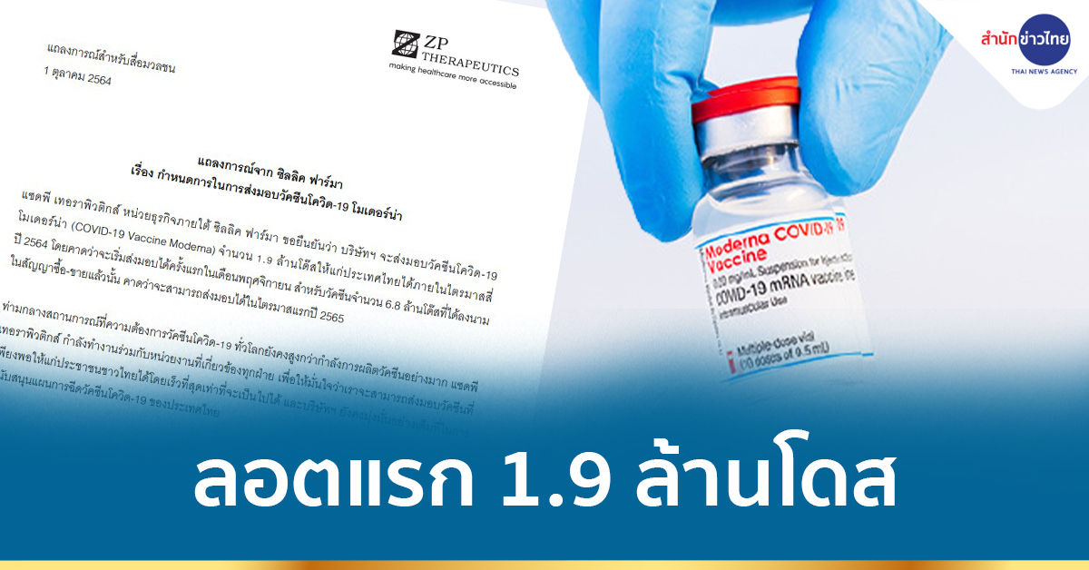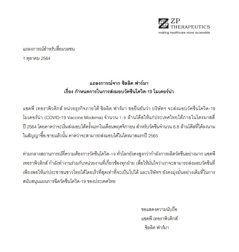 แซดพี เทอราพิวติกส์ หน่วยธุรกิจภายใต้ ซิลลิค ฟาร์มา ขอยืนยันว่า บริษัทฯ จะส่งมอบวัคซีนโควิด-19 โมเดอร์นา (COVID-19 Vaccine Moderna) จำนวน 1.9 ล้านโดส ให้แก่ประเทศไทยได้ภายในไตรมาส 4 ปี 2564 โดยคาดว่าจะเริ่มส่งมอบได้ครั้งแรกในเดือนพฤศจิกายน สำหรับวัคซีนจำนวน 6.8 ล้านโดสที่ได้ลงนามในสัญญาซื้อ-ขายแล้วนั้น คาดว่าจะสามารถส่งมอบได้ในไตรมาสแรกปี 2565