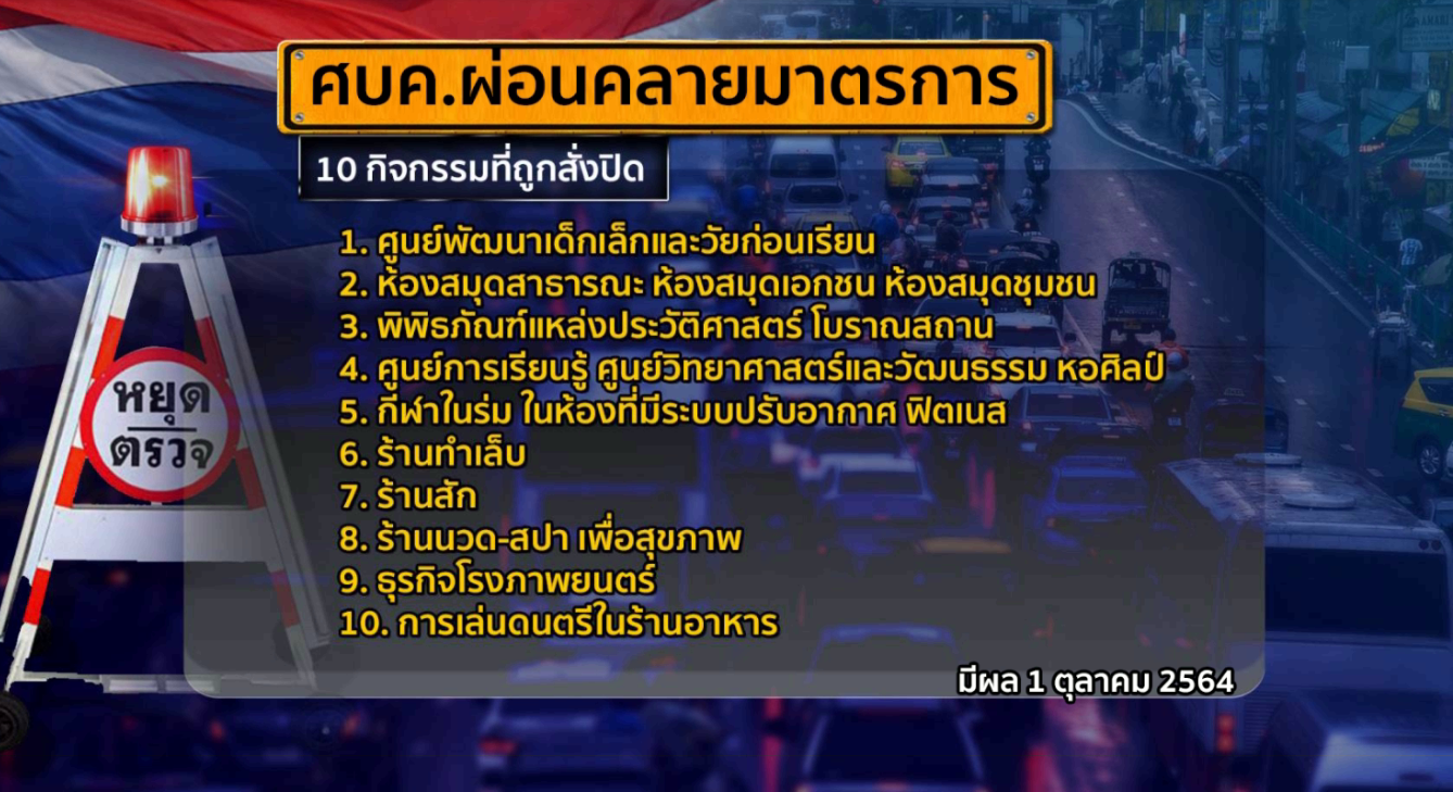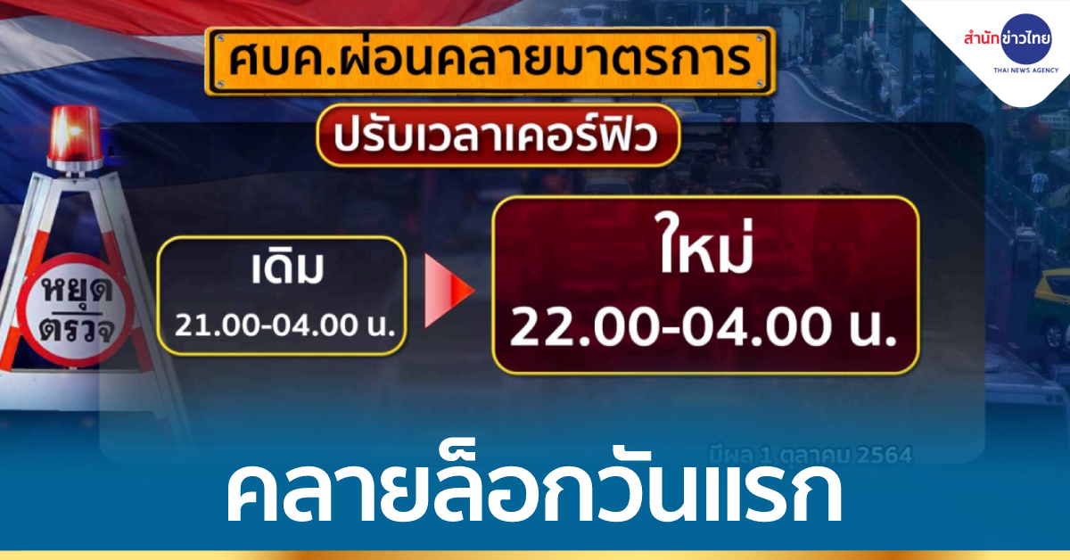 กรุงเทพฯ 1 ต.ค.- วันแรกของการคลายล็อกกิจกรรม/กิจการต่างๆ สามารถกลับมาดำเนินการได้ โดยเฉพาะพื้นที่ควบคุมสูงสุดและเข้มงวด 29 จังหวัด หรือสีแดงเข้ม ปรับเวลาเคอร์ฟิวเป็น 22.00-04.00 น.