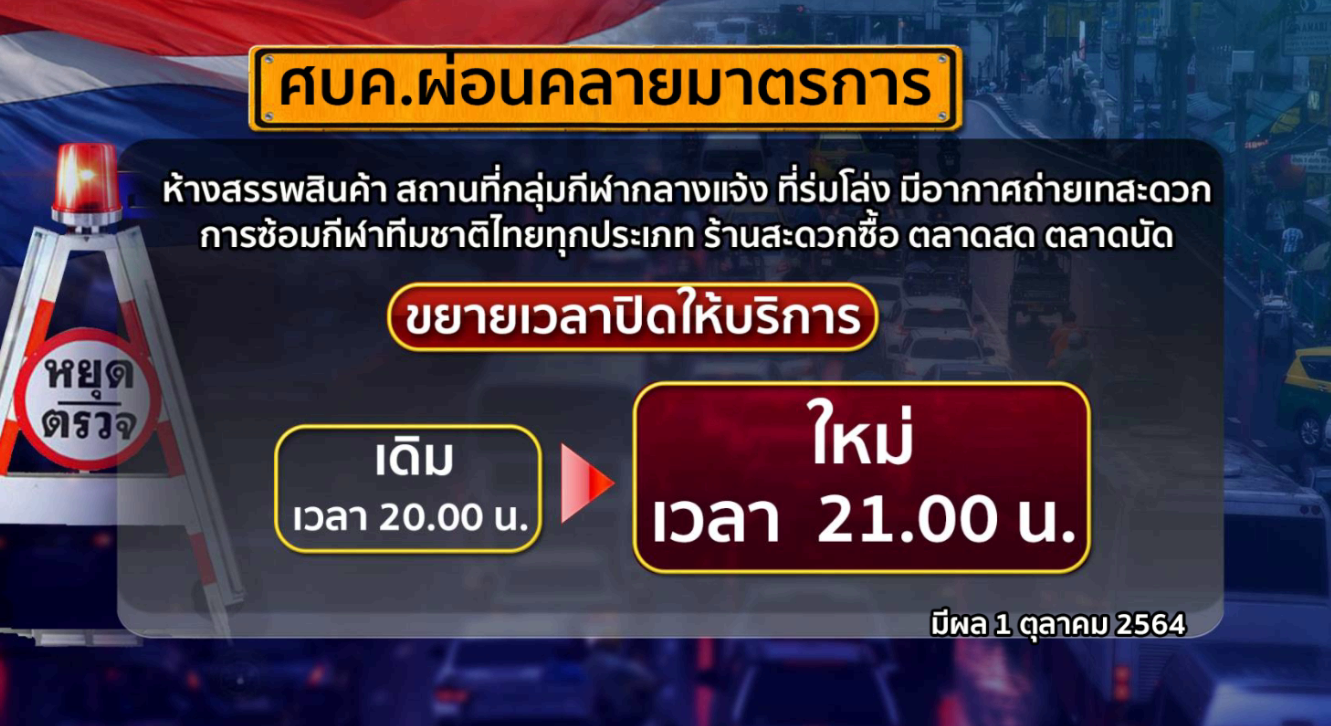 ลดเวลาการห้ามออกนอกเคหสถานเป็นเวลา 22.00-04.00 น. ห้างสรรพสินค้าเปิดได้ถึง 21.00 น. , ร้านสะดวกซื้อ ตลาดสด ตลาดนัด เฉพาะจำหน่ายเครื่องอุปโภคบริโภค เปิดได้ถึง 21.00 น. กีฬากลางแจ้งเปิดได้ทุกประเภทกีฬาไม่เกิน 21.00 น.