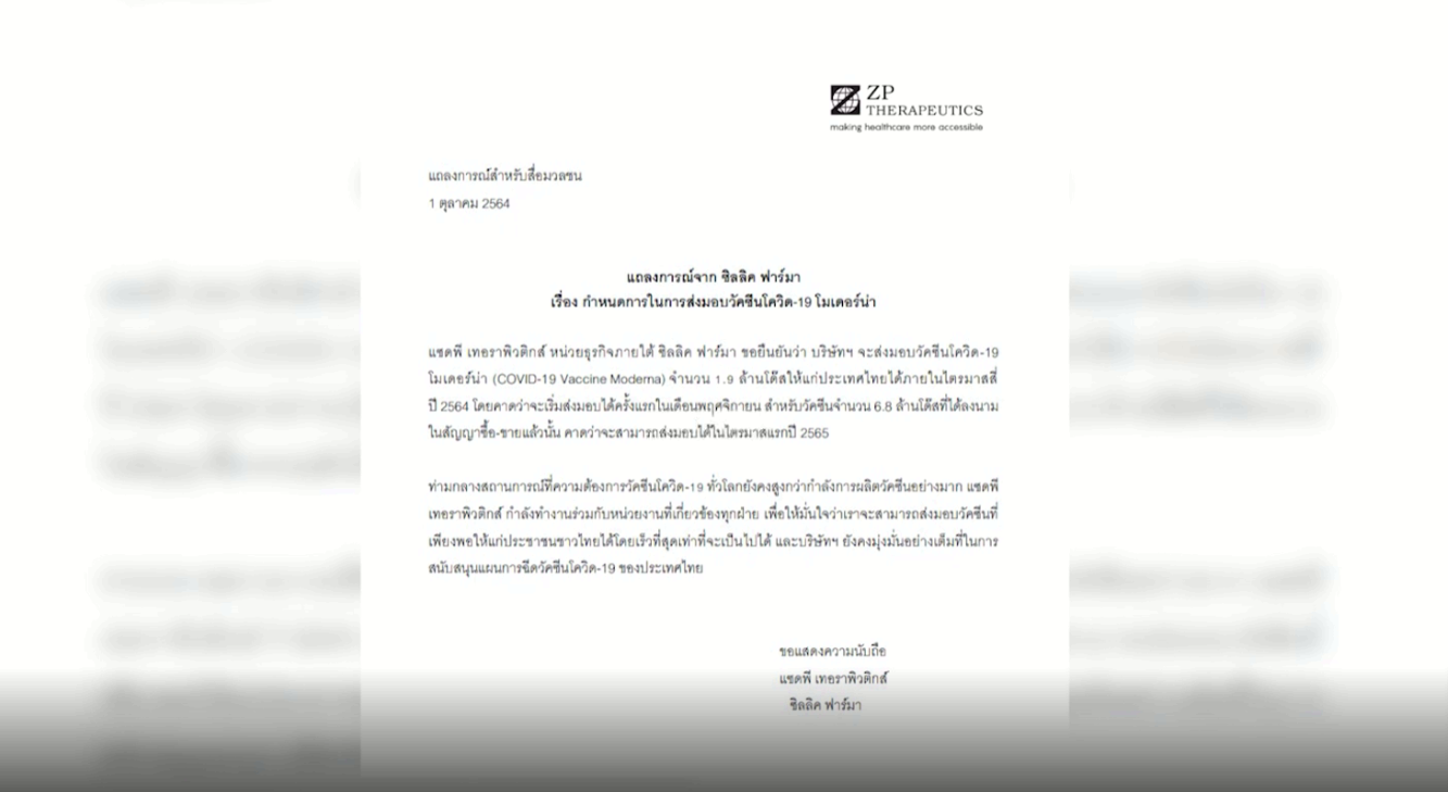 ด้านซิลลิค ฟาร์มา ขอยืนยันว่าบริษัทฯ จะส่งมอบวัคซีนโควิด-19 โมเดอร์นา 1.9 ล้านโดส ให้ประเทศไทยครั้งแรกในเดือนพฤศจิกายน สำหรับวัคซีนจำนวน 6.8 ล้านโดสที่ลงนามในสัญญาซื้อ-ขายแล้ว คาดว่าจะสามารถส่งมอบได้ในไตรมาสแรกปี 2565.-สำนักข่าวไทย