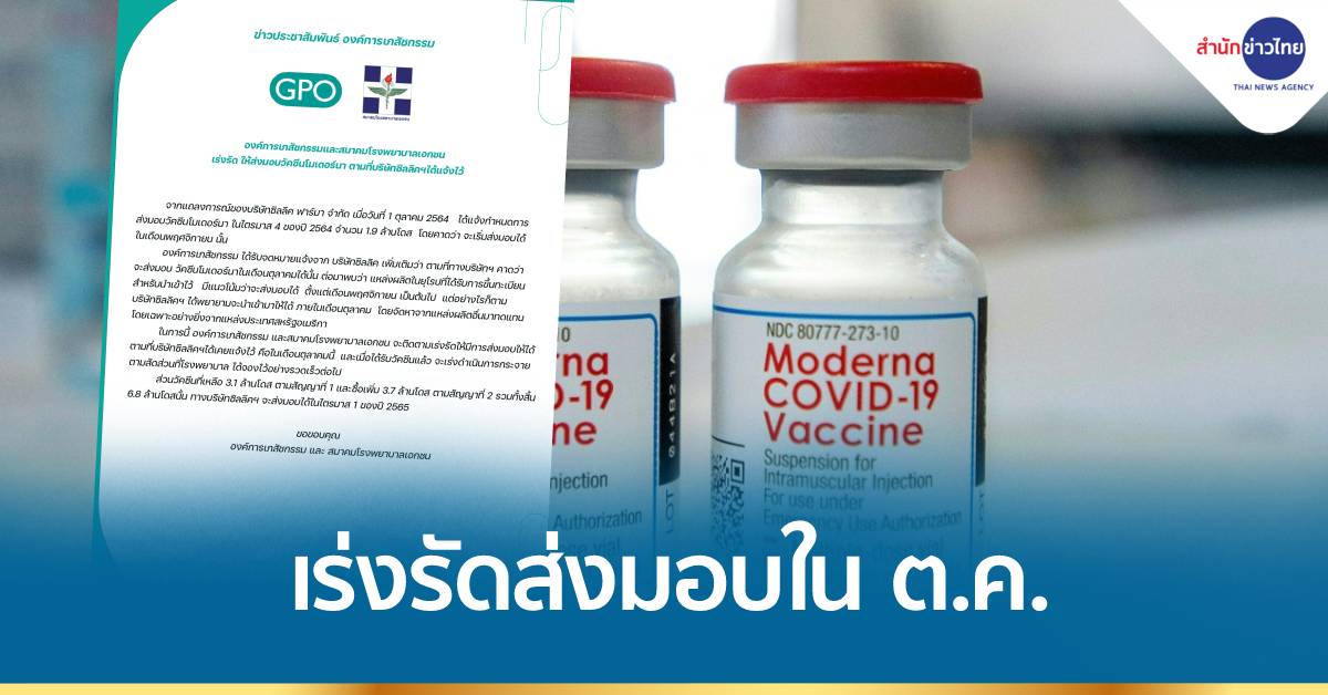 กทม. 2 ต.ค.-องค์การเภสัชกรรม และสมาคมโรงพยาบาลเอกชน เร่งรัดให้ส่งมอบวัคซีนโมเดอร์นา ตามที่บริษัทซิลลิคฯ ได้แจ้งไว้ คือในเดือนตุลาคม