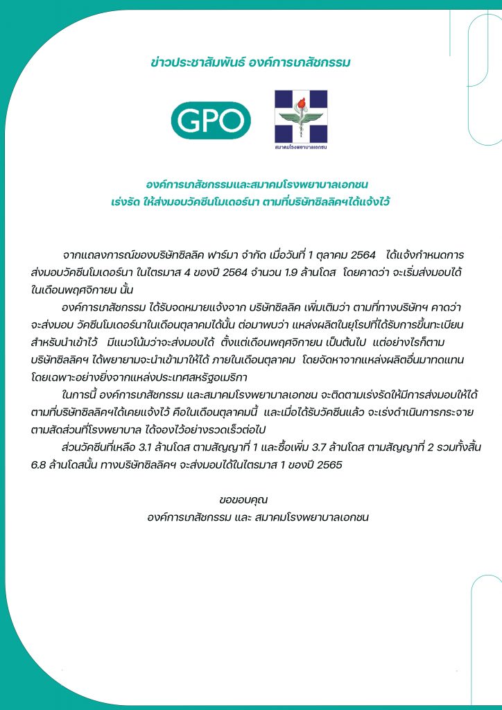 จากแถลงการณ์ของบริษัทซิลลิค ฟาร์มา จำกัด เมื่อวันที่ 1 ตุลาคม 2564 ได้แจ้งกำหนดการส่งมอบวัคซีนโมเดอร์นา ในไตรมาส 4 ของปี 2564 จำนวน 1.9 ล้านโดส โดยคาดว่าจะเริ่มส่งมอบได้ ในเดือนพฤศจิกายน นั้น องค์การเภสัชกรรม ได้รับจดหมายแจ้งจาก บริษัทซิลลิค เพิ่มเติมว่า ตามที่ทางบริษัทฯ คาดว่าจะส่งมอบ วัคซีนโมเดอร์นา ในเดือนตุลาคมได้นั้น ต่อมาพบว่า แหล่งผลิตในยุโรปที่ได้รับการขึ้นทะเบียนสำหรับนำเข้าไว้ มีแนวโน้มว่าจะส่งมอบได้ตั้งแต่เดือนพฤศจิกายน เป็นต้นไป แต่อย่างไรก็ตามบริษัทซิลลิคฯ ได้พยายามจะนำเข้ามาให้ได้ภายในเดือนตุลาคม โดยจัดหาจากแหล่งผลิตอื่นมาทดแทนโดยเฉพาะอย่างยิ่งจากแหล่งประเทศสหรัฐอเมริกา