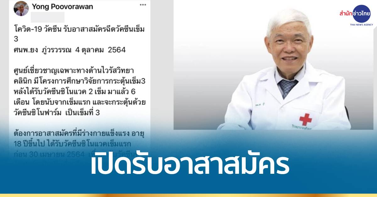 ศ.นพ.ยง ภู่วรวรรณ หัวหน้าศูนย์เชี่ยวชาญเฉพาะทางด้านไวรัสวิทยาคลินิก ภาควิชากุมารเวชศาสตร์ คณะแพทยศาสตร์ จุฬาลงกรณ์มหาวิทยาลัย โพสต์เฟซบุ๊ก Yong Poovorawan วันนี้ (4 ต.ค.) ว่า โควิด-19 วัคซีน รับอาสาสมัครฉีดวัคซีนเข็ม 3