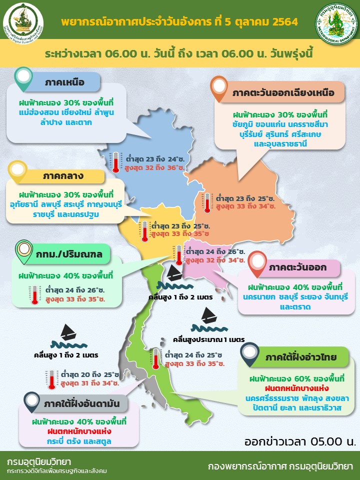 อนึ่ง ในช่วงวันที่ 5-10 ต.ค.64 หย่อมความกดอากาศต่ำบริเวณทะเลจีนใต้ตอนกลาง มีแนวโน้มที่จะทวีกำลังแรงขึ้น และเคลื่อนตัวเข้าใกล้เกาะไหหลำ ประเทศจีน ขอให้ประชาชนติดตามข่าวพยากรณ์อากาศจากกรมอุตุนิยมวิทยาอย่างใกล้ชิด