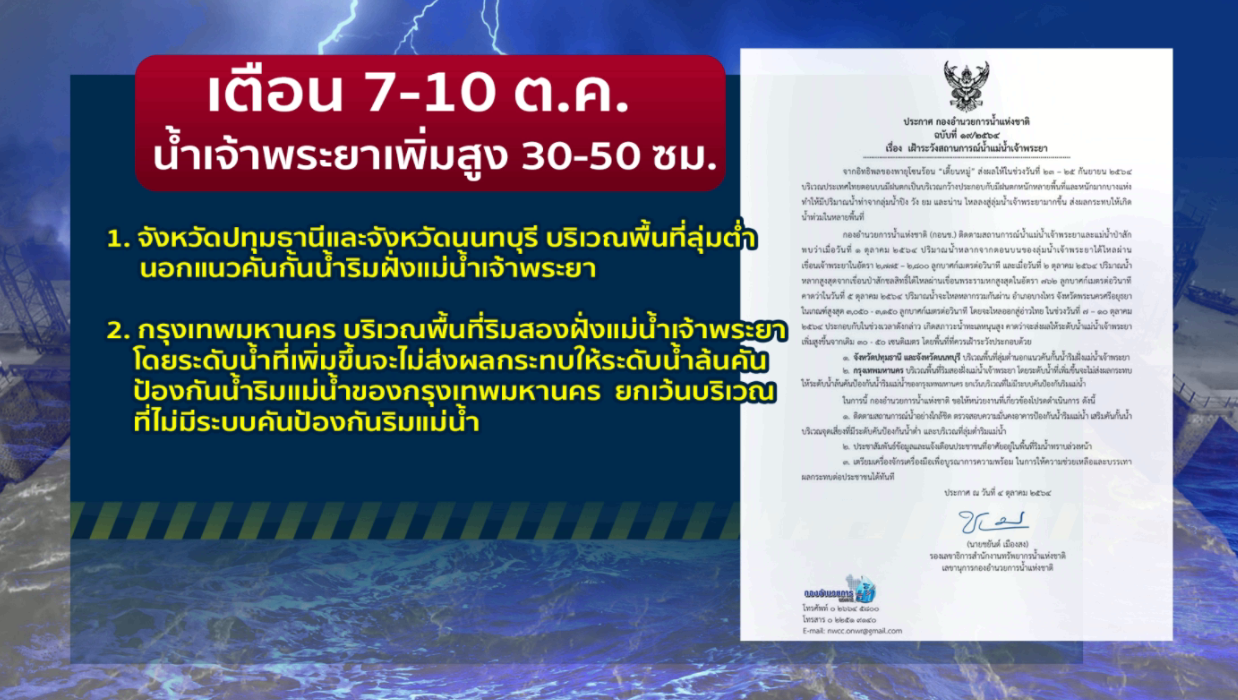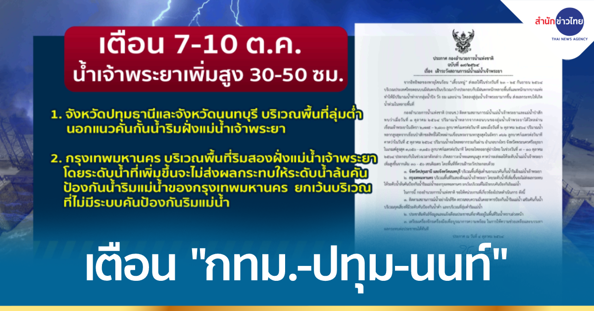 กองอำนวยการน้ำแห่งชาติ หรือ กอนช. ออกประกาศฉบับที่ 19 เรื่อง “เฝ้าระวังสถานการณ์น้ำแม่น้ำเจ้าพระยา” เนื่องจากคาดว่าในวันนี้ (5 ต.ค.) ปริมาณน้ำที่ไหลหลากรวมกัน ผ่านอำเภอบางไทร จังหวัดพระนครศรีอยุธยา จะอยู่ในเกณฑ์สูงสุด คือ 3,050 – 3,150 ลูกบาศก์เมตรต่อวินาที และไหลออกอ่าวไทยวันที่ 7-10 ตุลาคม ประกอบกับในช่วงเวลาดังกล่าวเกิดสภาวะน้ำทะเลหนุนสูง คาดว่าจะส่งผลให้ระดับน้ำแม่น้ำเจ้าพระยาเพิ่มสูงขึ้นจากเดิม 30 – 50 เซนติเมตร