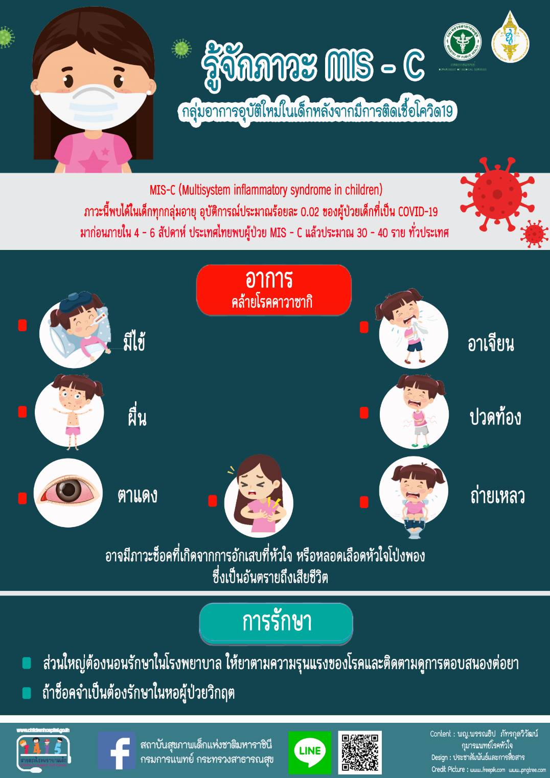 นพ.สมศักดิ์ อรรฆศิลป์ อธิบดีกรมการแพทย์ เปิดเผยว่า MIS-C (มิสซี) เป็นกลุ่มอาการอุบัติใหม่ที่พบในเด็กซึ่งร่างกายมีการอักเสบหลายระบบหลังจากมีการติดเชื้อ SARS- CoV-2 สาเหตุเชื่อว่าเกิดจากการตอบสนองของภูมิคุ้มกันในร่างกายต่อเชื้อไวรัสนี้ที่มากเกินไป ทำให้เกิดความผิดปกติของร่างกายหลายระบบตามมา ภาวะนี้พบได้ในเด็กทุกกลุ่มอายุ อุบัติการณ์ประมาณร้อยละ0.02 ของผู้ป่วยเด็กที่เป็น COVID-19