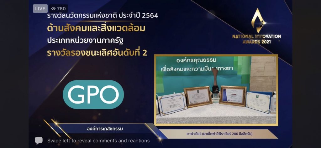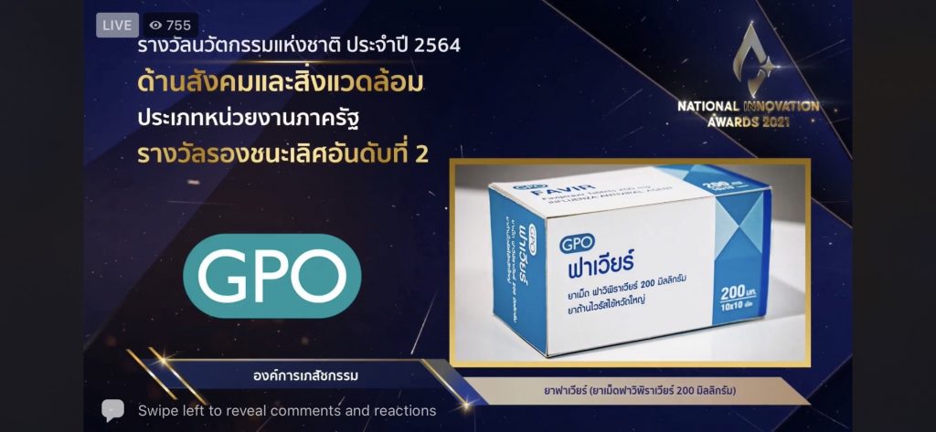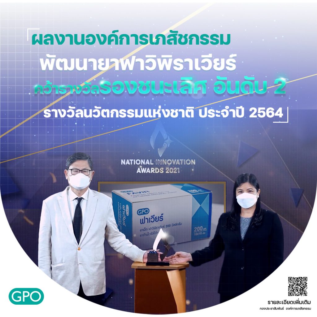 กรุงเทพฯ 5 ต.ค.-ผลงานองค์การเภสัชกรรมในการพัฒนายาฟาวิพิราเวียร์ ได้รับรางวัลรองชนะเลิศ อันดับ 2 รางวัลนวัตกรรมแห่งชาติ ประจำปี 2564 ด้านสังคมและสิ่งแวดล้อม ประเภทหน่วยงานรัฐ จากสำนักงานนวัตกรรมแห่งชาติ
