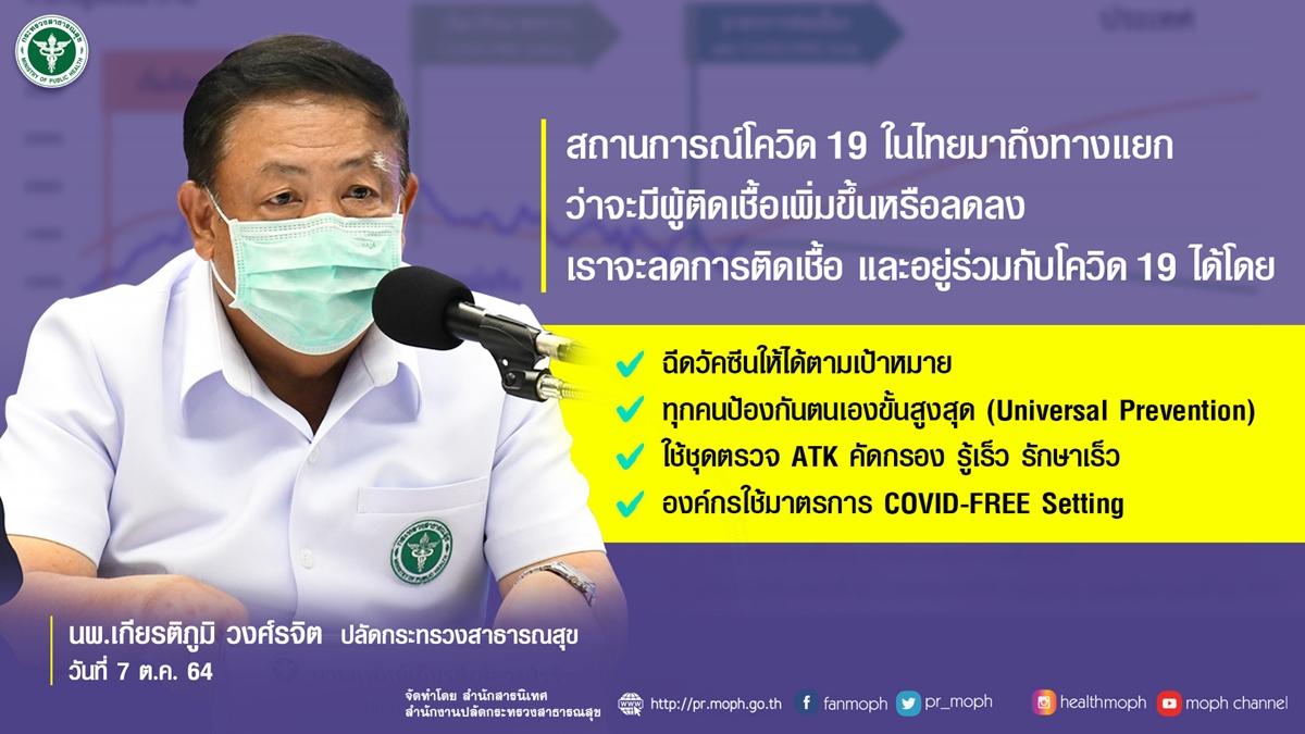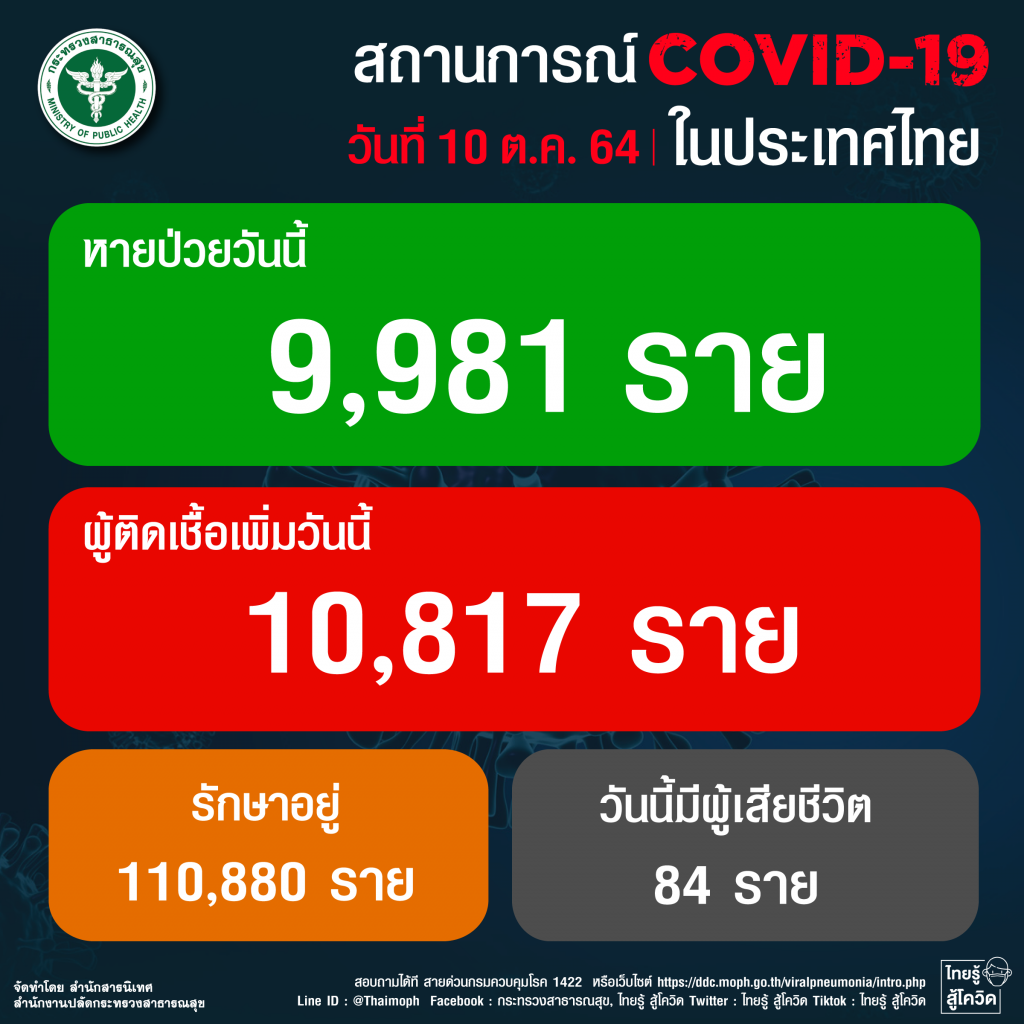 วันนี้ (10 ตุลาคม 2564) นพ.เกียรติภูมิ วงศ์รจิต ปลัดกระทรวงสาธารณสุข ให้สัมภาษณ์ว่า วันนี้มีผู้ป่วยโควิด-19 หายป่วยกลับบ้านได้ 9,981 ราย หายป่วยสะสม 1,554,887 ราย ติดเชื้อรายใหม่ 10,817 ราย อยู่ระหว่างการรักษา 110,880 ราย และเสียชีวิต 84 ราย ภาพรวมในขณะนี้แนวโน้มทรงตัว บางพื้นที่พบการระบาดเป็นกลุ่มก้อนจากการรวมกลุ่มทำกิจกรรม อาทิ งานสังสรรค์ งานศพ รวมถึงยังพบการติดเชื้อในโรงงาน สถานประกอบการ แคมป์ก่อสร้าง สถานที่ดูแลกลุ่มเปราะบาง และกลุ่มแรงงานต่างด้าว ขณะที่บางพื้นที่สถานการณ์เริ่มดีขึ้น พบผู้ติดเชื้อประปรายและสามารถควบคุมได้ รัฐบาลจึงมีแนวทางที่จะเปิดกิจการ กิจกรรม และเปิดพื้นที่รับนักท่องเที่ยว เพื่อสร้างรายได้ในชุมชนและขับเคลื่อนเศรษฐกิจประเทศมากขึ้น