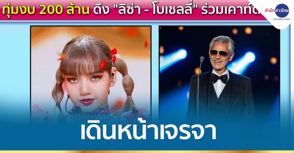 กทม. 14 ต.ค. – รมว.ท่องเที่ยวและกีฬา ยืนยันกำลังเจรจาดึง “ลิซ่า Blackpink” และ “แอนเดรีย โบเชลลี” นักร้องโอเปร่าชื่อดังร่วมกิจกรรมเคาท์ดาวน์