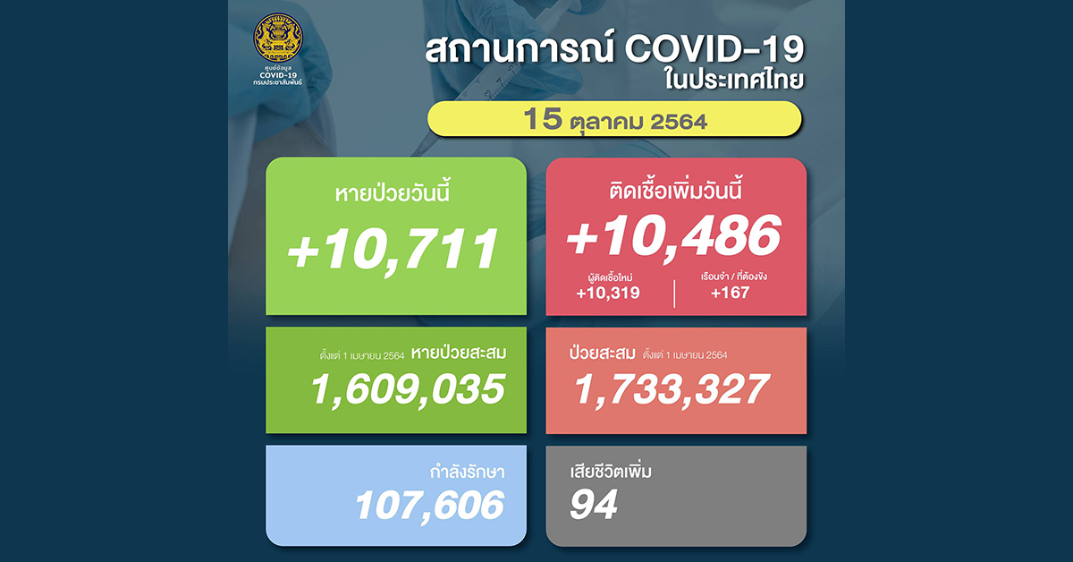 กรุงเทพฯ 15 ต.ค.-โควิดวันนี้ ยอดติดเชื้อรวม 10,486 ราย หายกลับบ้าน 10,711 ราย เสียชีวิต 94 ราย ป่วยสะสมระลอกเมษายน 1,733,327 ราย
