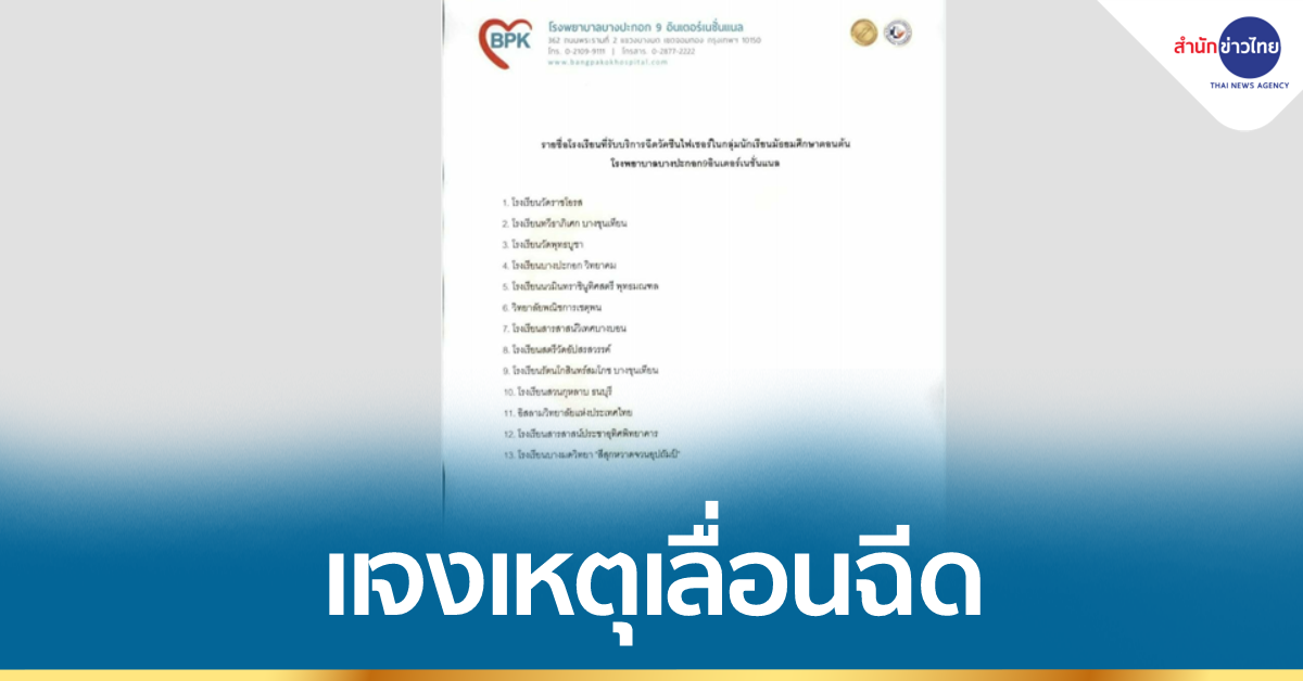 จากกรณีที่โรงพยาบาลบางปะกอก 9 อินเตอร์เนชั่นแนล ส่งหนังสือเรื่อง ขอเลื่อนการฉีดวัคซีนไฟเซอร์ของนักเรียน ส่งถึงผู้อำนวยการโรงเรียน แจ้งเลื่อนการฉีดวัคซีนให้กับนักเรียนใน 13 โรงเรียน โดยข้อความระบุว่า เนื่องจากรัฐบาลได้กำหนดให้ฉีดวัคซีนไฟเซอร์กับนักเรียน อายุตั้งแต่ 12-18 ปี และโรงพยาบาลได้ดำเนินการร่วมกับภาครัฐ เพื่อจัดสรรให้บุคลากรได้เข้าไปฉีดวัคซีนกับโรงเรียนต่างๆ และได้นัดหมายวันเวลา ในการฉีดวัคซีนเรียบร้อย แต่พบว่าวันที่ 14 ต.ค.64 เวลาประมาณ 13.30 น. ได้รับแจ้งจากสำนักอนามัย ว่า ขอเลื่อนการส่งวัคซีนไฟเซอร์ให้กับทางโรงพยาบาลโดยไม่มีกำหนด หากวัคซีนมาถึงจะจัดสรรให้โรงพยาบาลนำไปฉีดนักเรียนทันที