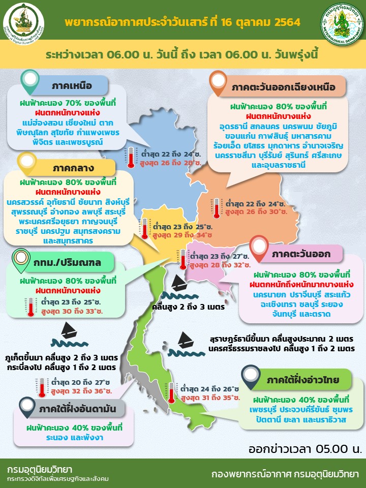 กทม. 16 ต.ค.-กรมอุตุฯ เตือนภาคเหนือตอนล่าง อีสาน กลาง ตะวันออก ฝนตกหนักมากบางแห่ง ระวังน้ำท่วมฉับพลัน น้ำป่าไหลหลาก ส่วน กทม.-ปริมณฑล ฝนฟ้าคะนองร้อยละ 80