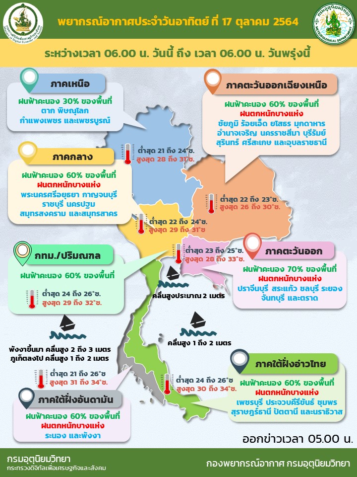 - ภาคตะวันออกเฉียงเหนือ มีฝนฟ้าคะนองร้อยละ 60 ของพื้นที่ กับมีฝนตกหนักบางแห่ง บริเวณจังหวัดชัยภูมิ ร้อยเอ็ด ยโสธร มุกดาหาร อำนาจเจริญ นครราชสีมา บุรีรัมย์ สุรินทร์ ศรีสะเกษ และอุบลราชธานี อุณหภูมิต่ำสุด 22-23 องศาเซลเซียส อุณหภูมิสูงสุด 26-30 องศาเซลเซียส