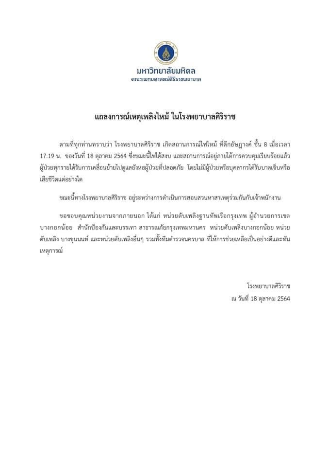 ตามที่ทุกท่านทราบว่า โรงพยาบาลศิริราช เกิดสถานการณ์ไฟไหม้ ที่ตึกอัษฎางค์ ชั้น 8 เมื่อเวลา 17.19 น. ของวันที่ 18 ตุลาคม 2564 ซึ่งขณะนี้ไฟได้สงบ และสถานการณ์อยู่ภายใต้การควบคุมเรียบร้อยแล้ว ผู้ป่วยทุกรายได้รับการเคลื่อนย้ายไปดูแลยังหอผู้ป่วยที่ปลอดภัย โดยไม่มีผู้ป่วยหรือบุคลากรได้รับบาดเจ็บหรือเสียชีวิตแต่อย่างใด ขณะนี้ทางโรงพยาบาลศิริราช อยู่ระหว่างการดำเนินการสอบสวนหาสาเหตุร่วมกันกับเจ้าพนักงาน