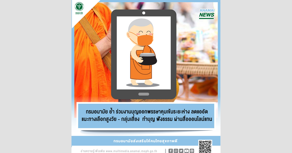 กรมอนามัย 20 ต.ค.-กรมอนามัย กระทรวงสาธารณสุข แนะออกพรรษาปีนี้ขอให้ประชาชนคุมเข้มระยะห่าง ลดความแออัด กลุ่มผู้สูงอายุและกลุ่มเสี่ยงอาจเลี่ยงด้วยการอยู่บ้านทำบุญ ฟังเทศน์ ประกอบพิธีกรรมทางศาสนาผ่านช่องทางออนไลน์แทน